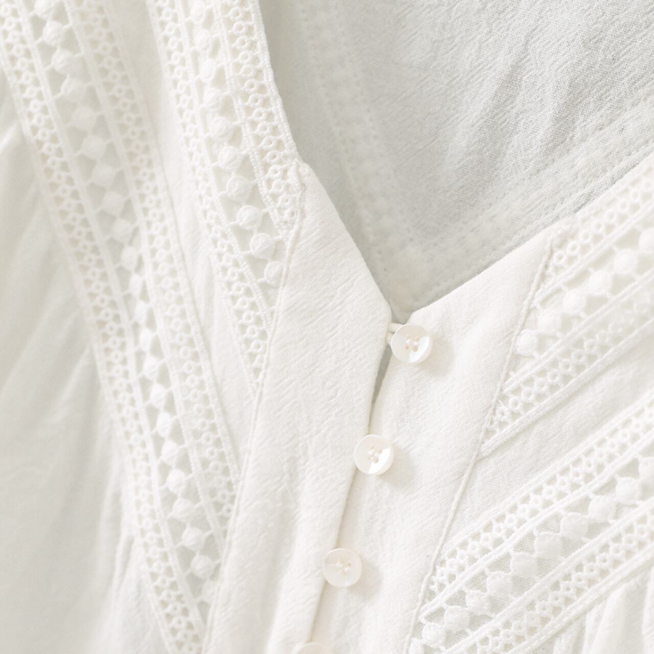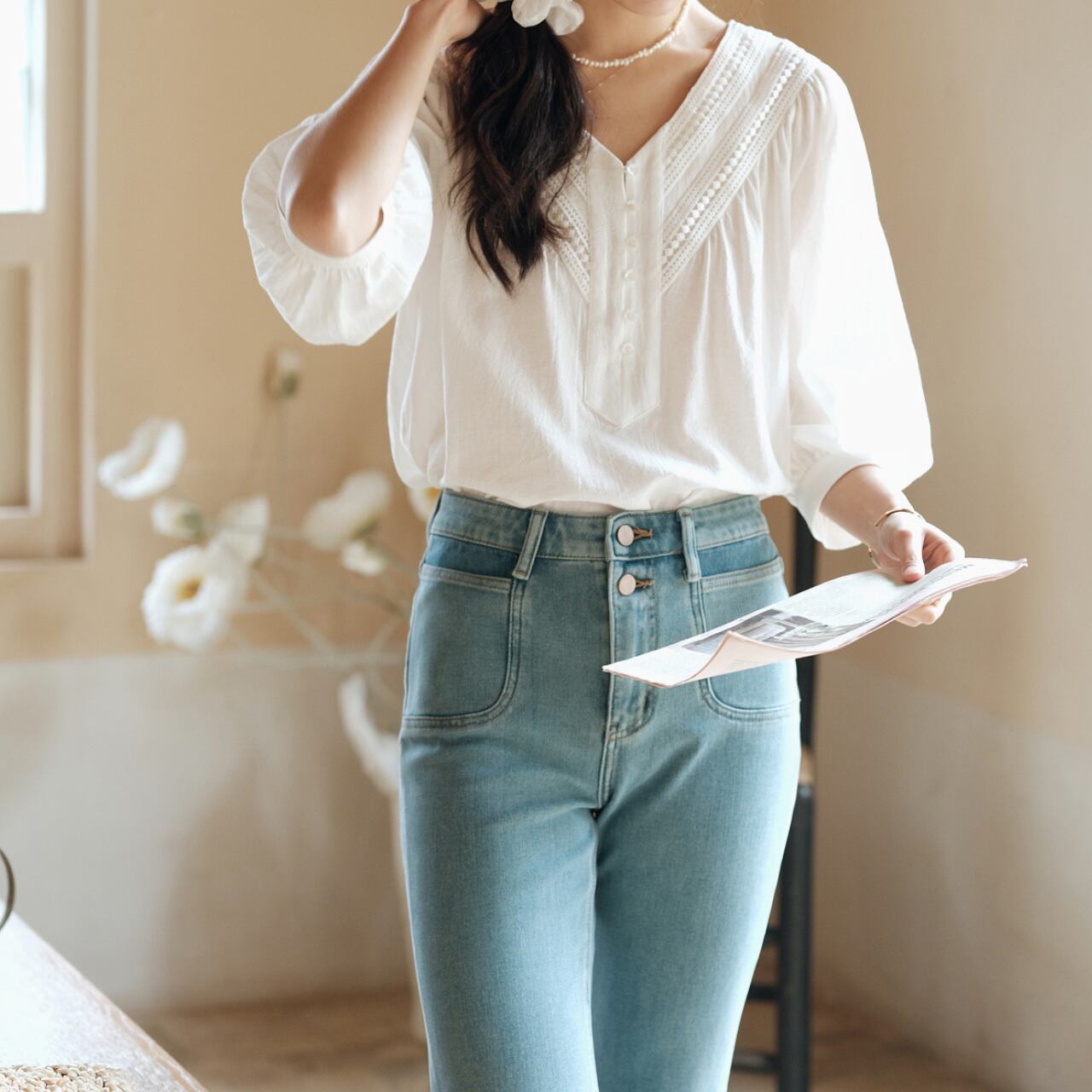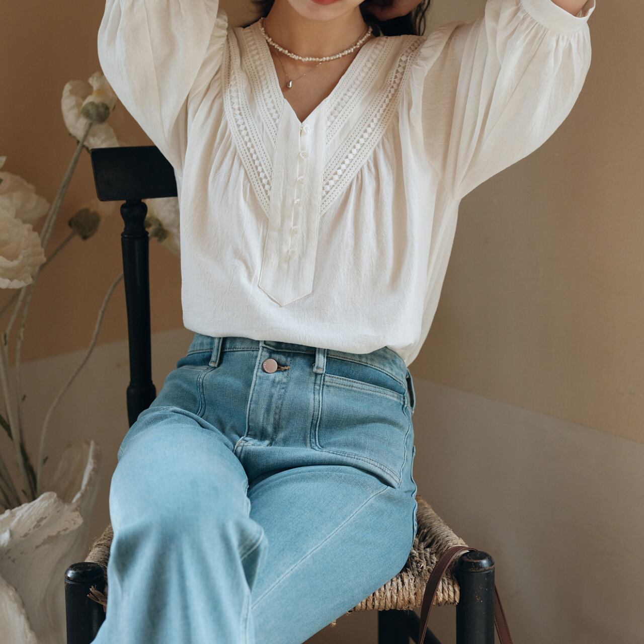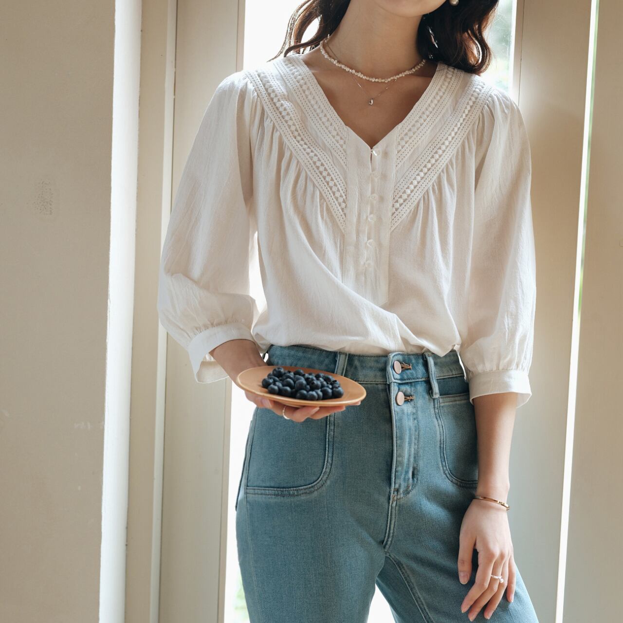 ネックラインを彩るレースが上品で美しい、7分袖のブラウス。