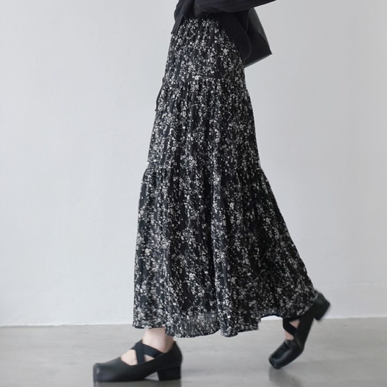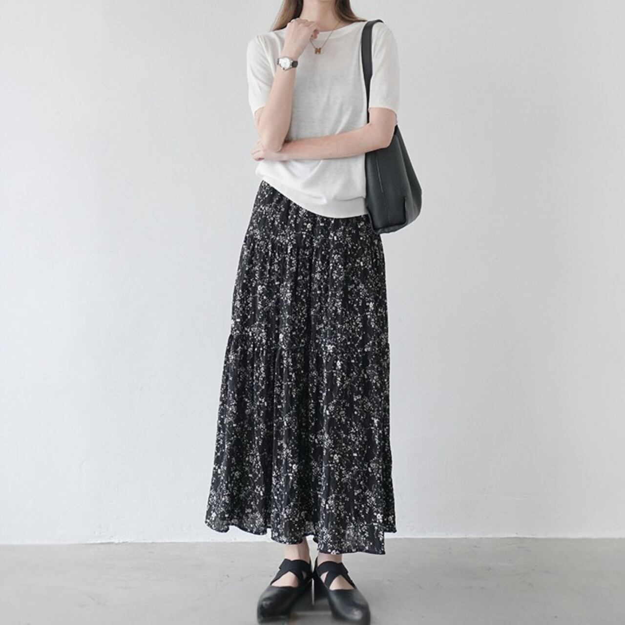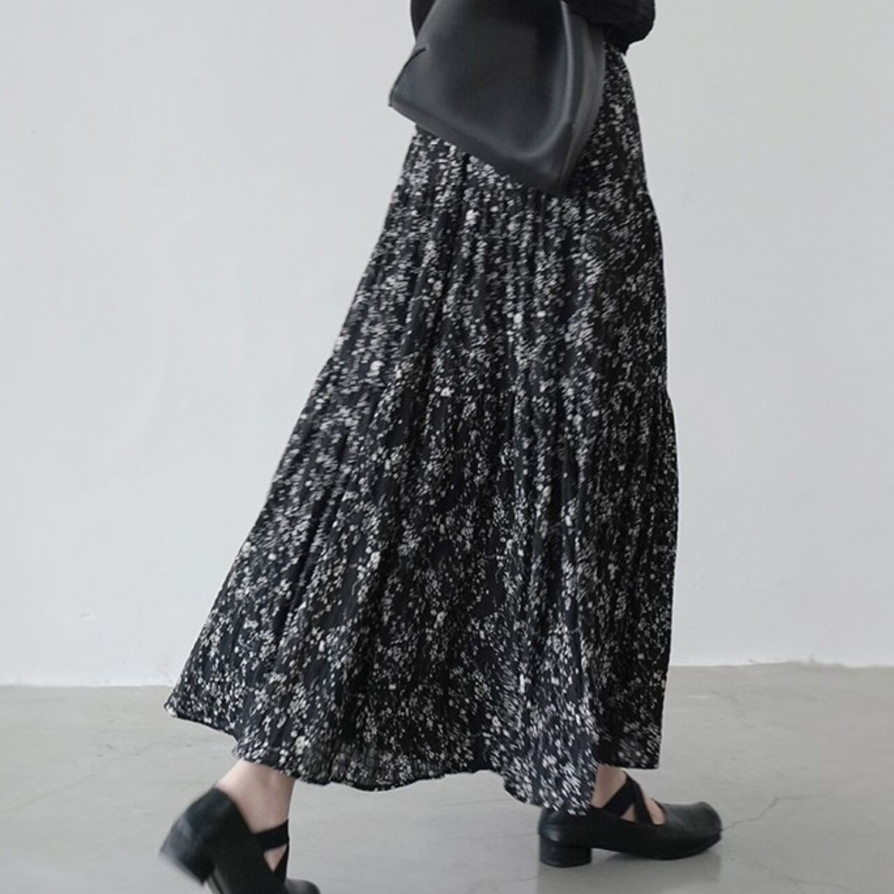 モノトーンの小花柄が上品で大人可愛い、マキシ丈のティアードスカート。