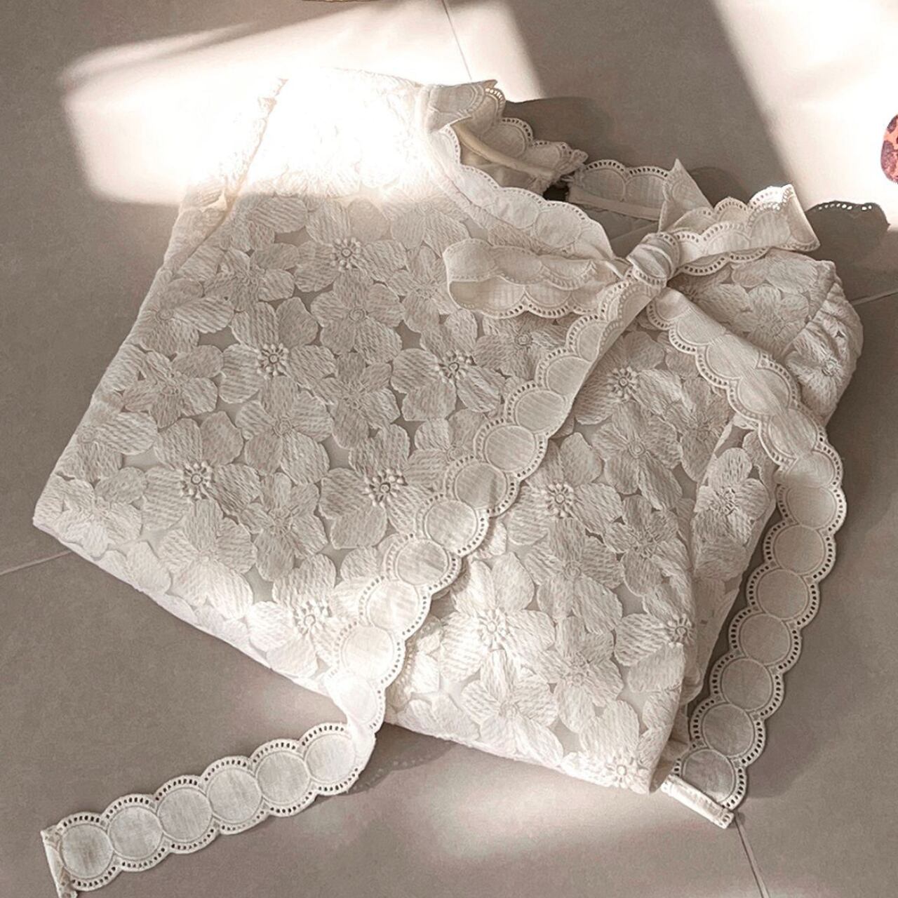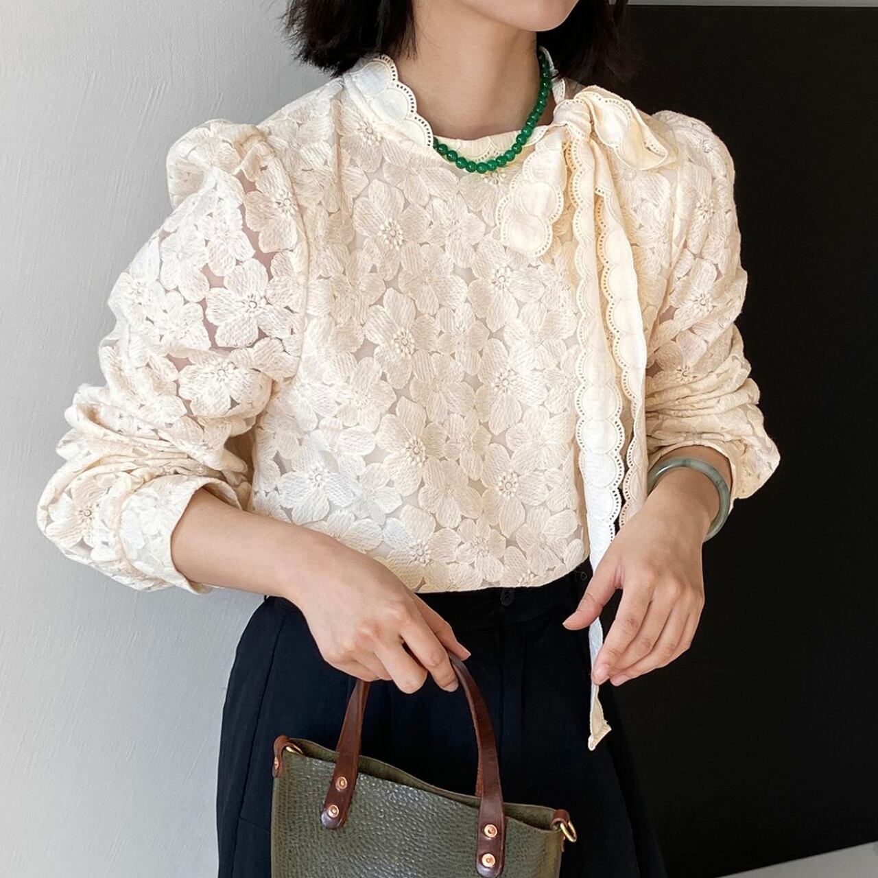 華やかさのあるフラワーレース×フリルがキュートなリボンネックが特徴的な、長袖ブラウス。