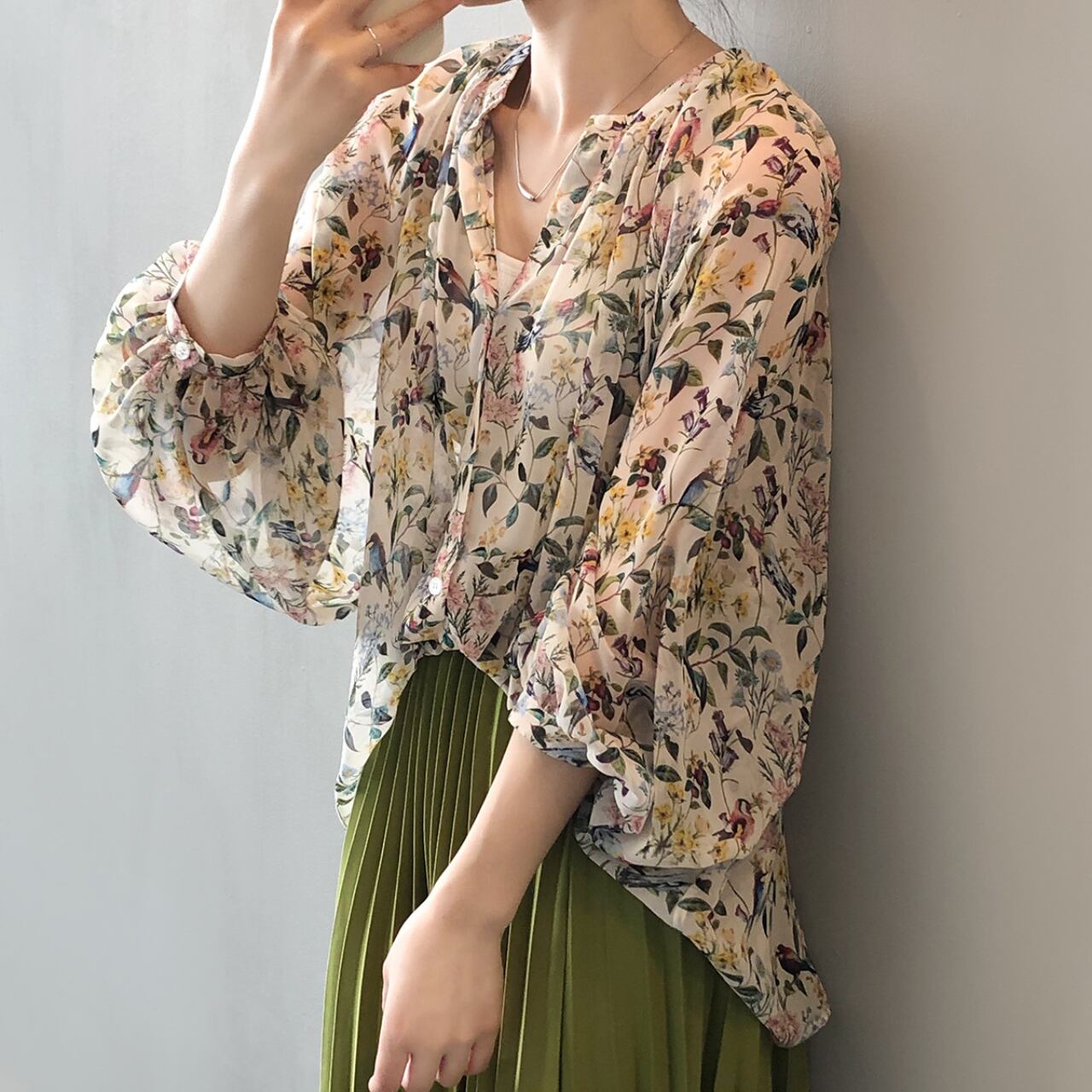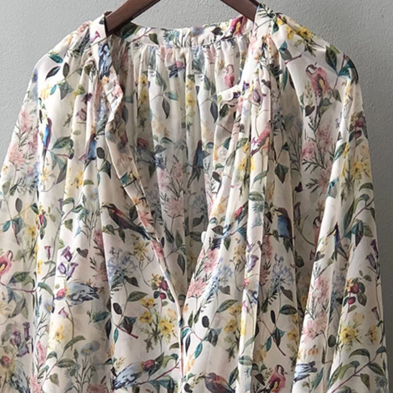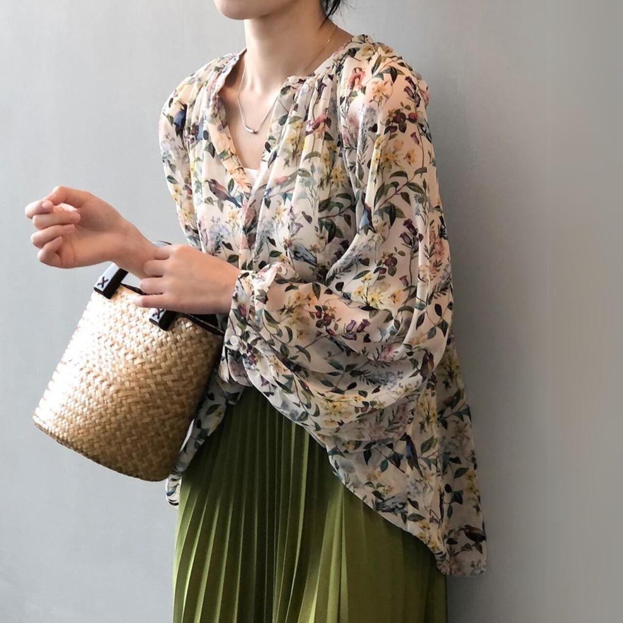 華やかなボタニカル柄が美しい、バンドカラーのシフォンブラウス。