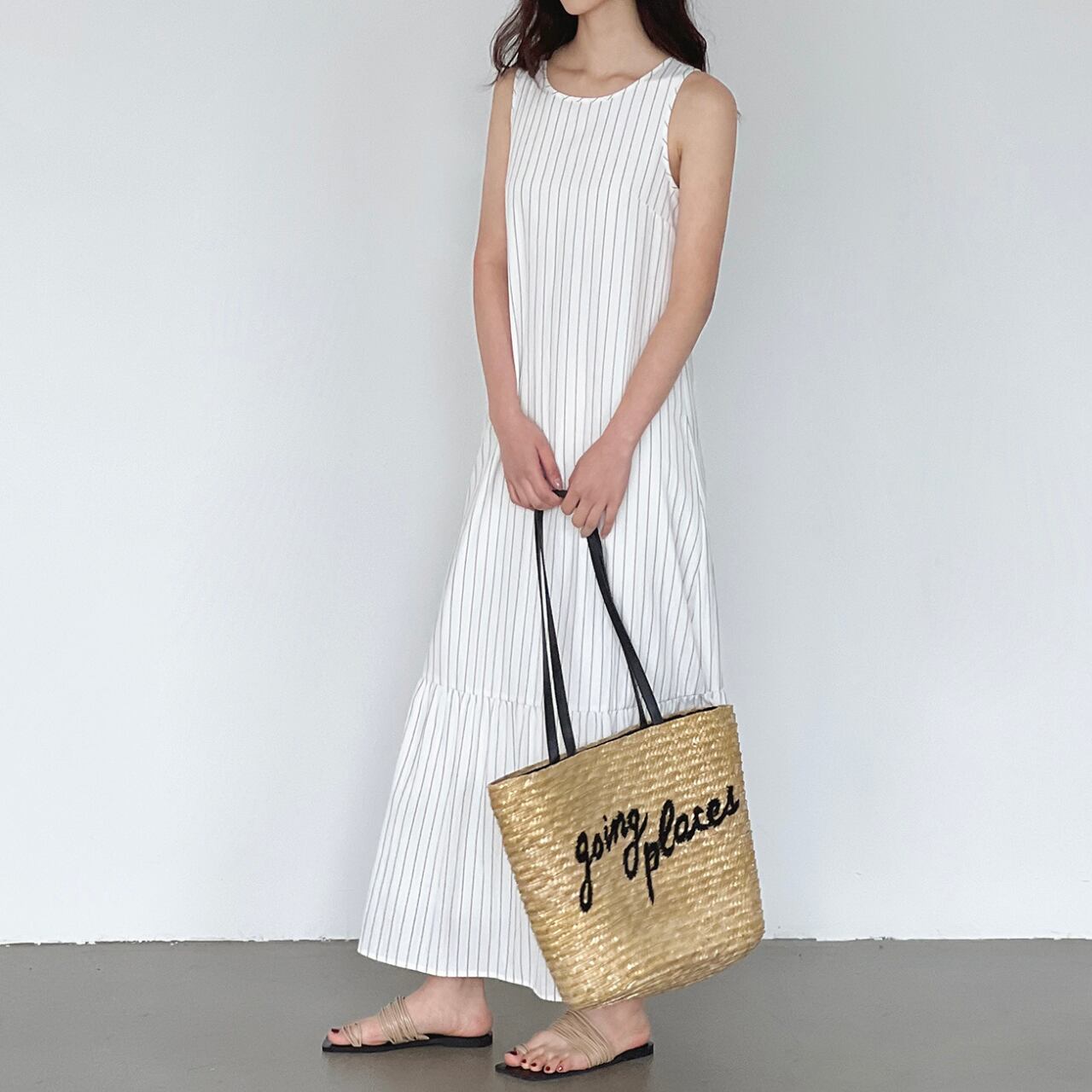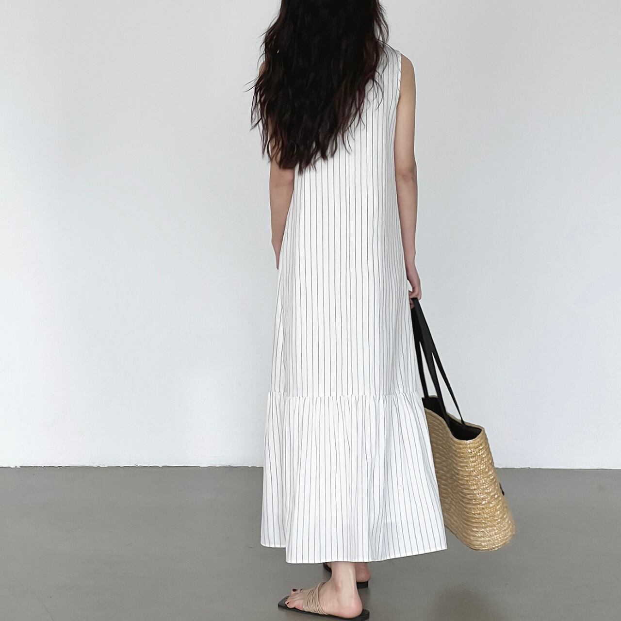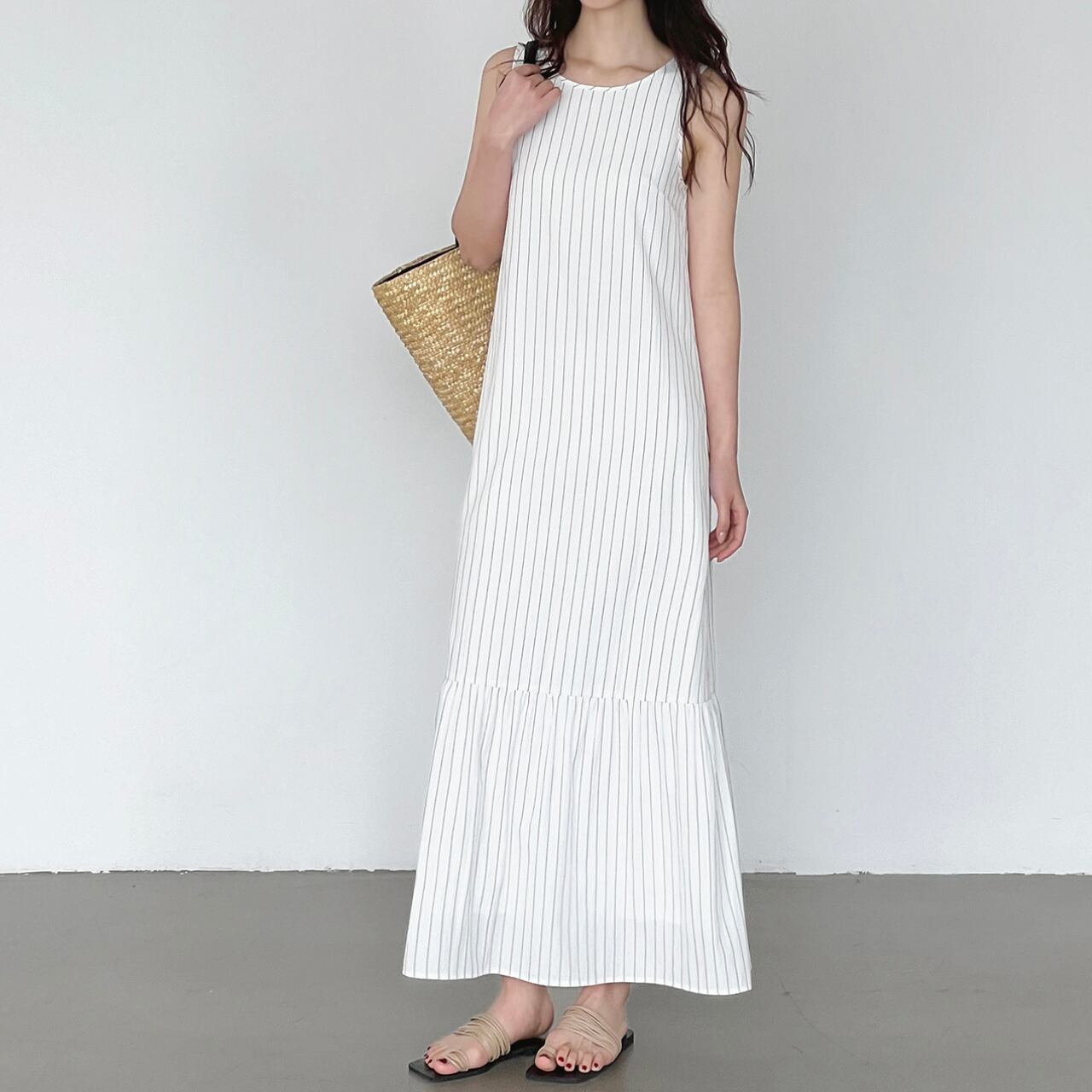 すっきりとした縦ラインを描くモノトーンストライプが上品な、ノースリーブワンピース。