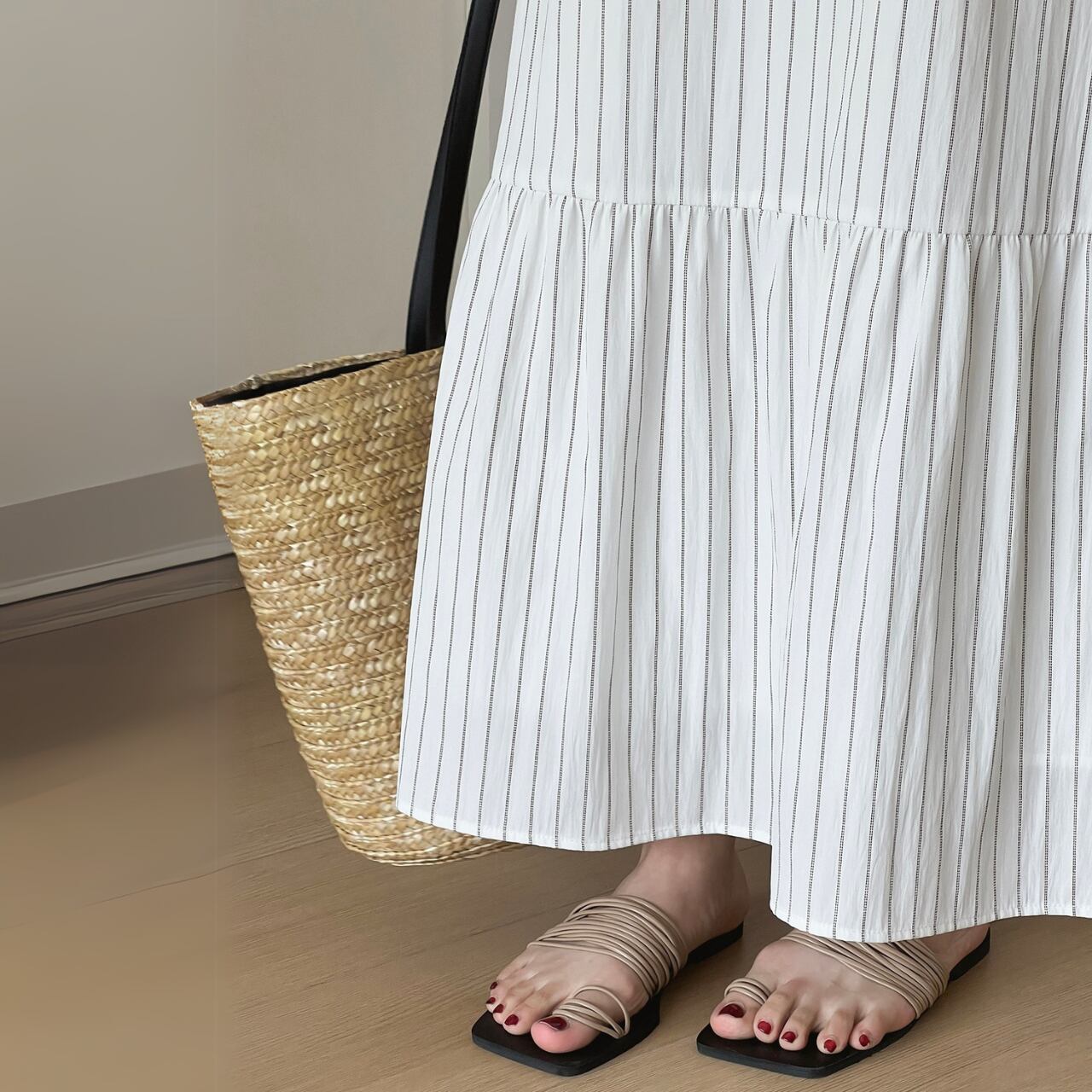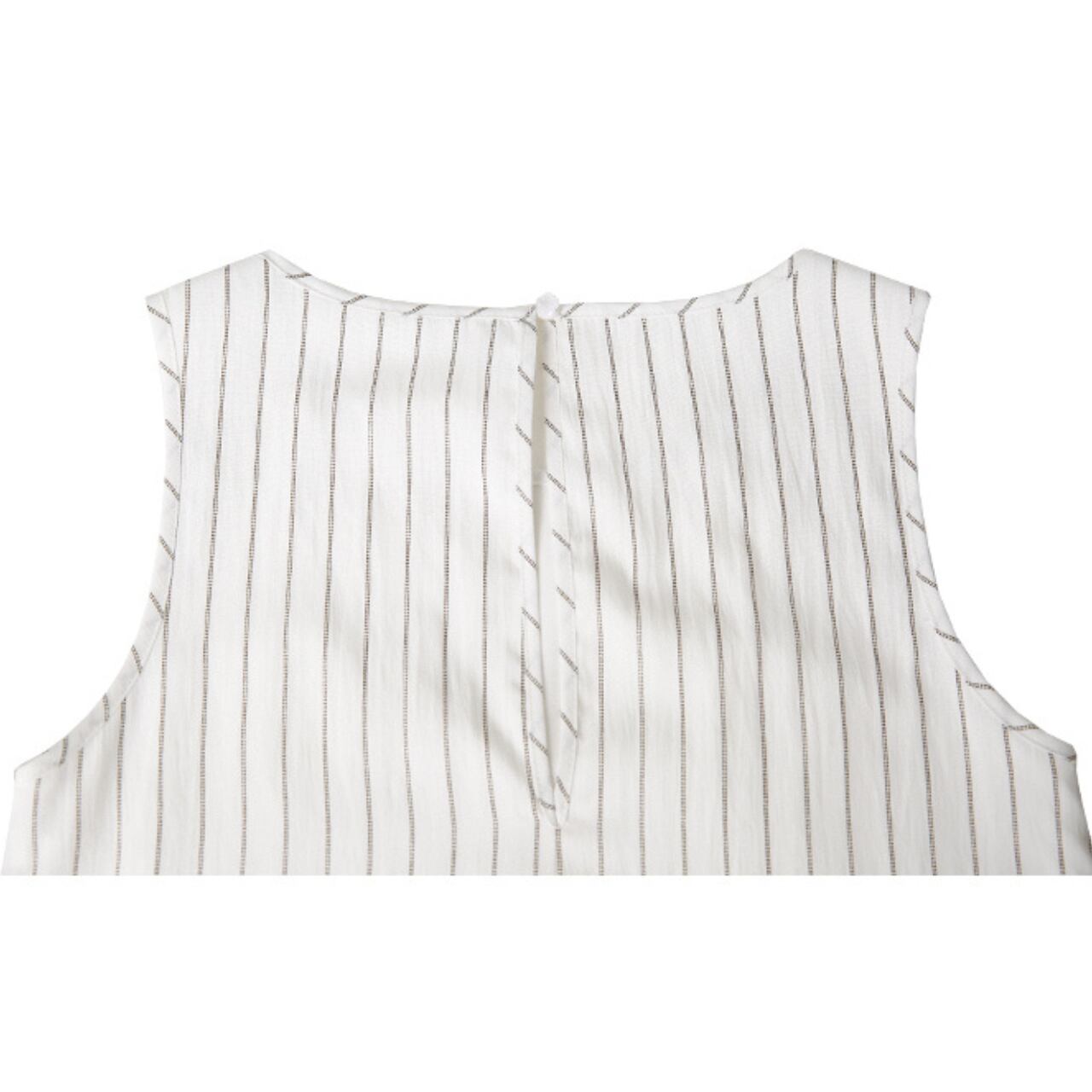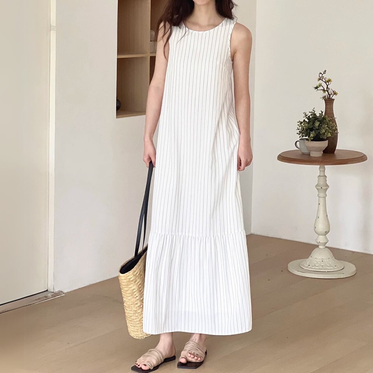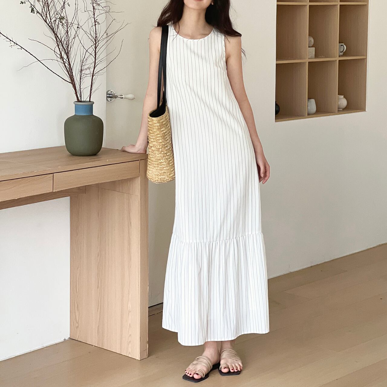 すっきりとした縦ラインを描くモノトーンストライプが上品な、ノースリーブワンピース。