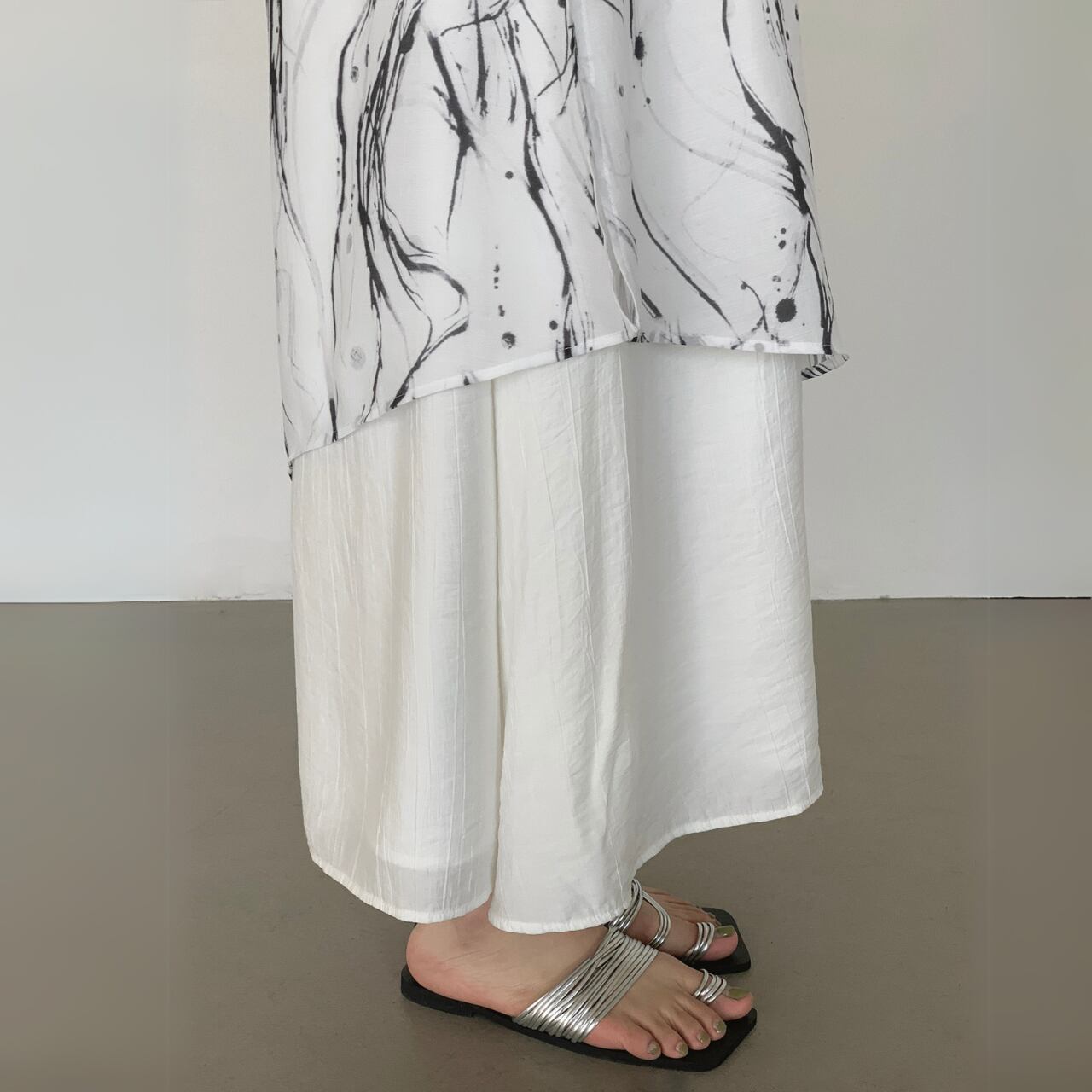 裾に重ねたレイヤード風のデザインがオシャレで、シンプルながらに奥行きのあるスタイリングに。