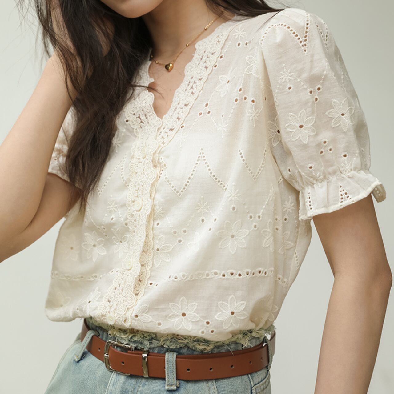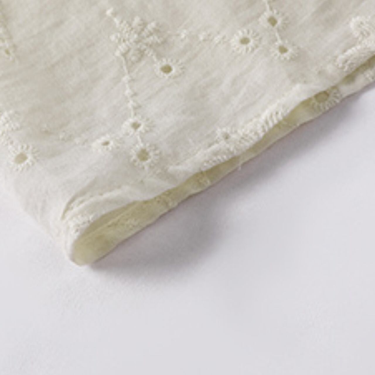 フラワーモチーフのアイレット刺繍がさりげなく華やかで、女性らしい柔らかい印象に仕上げてくれます。