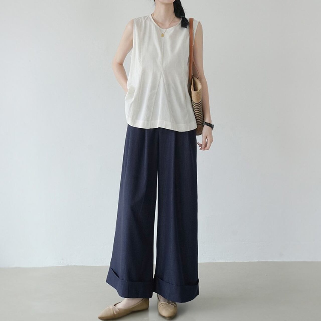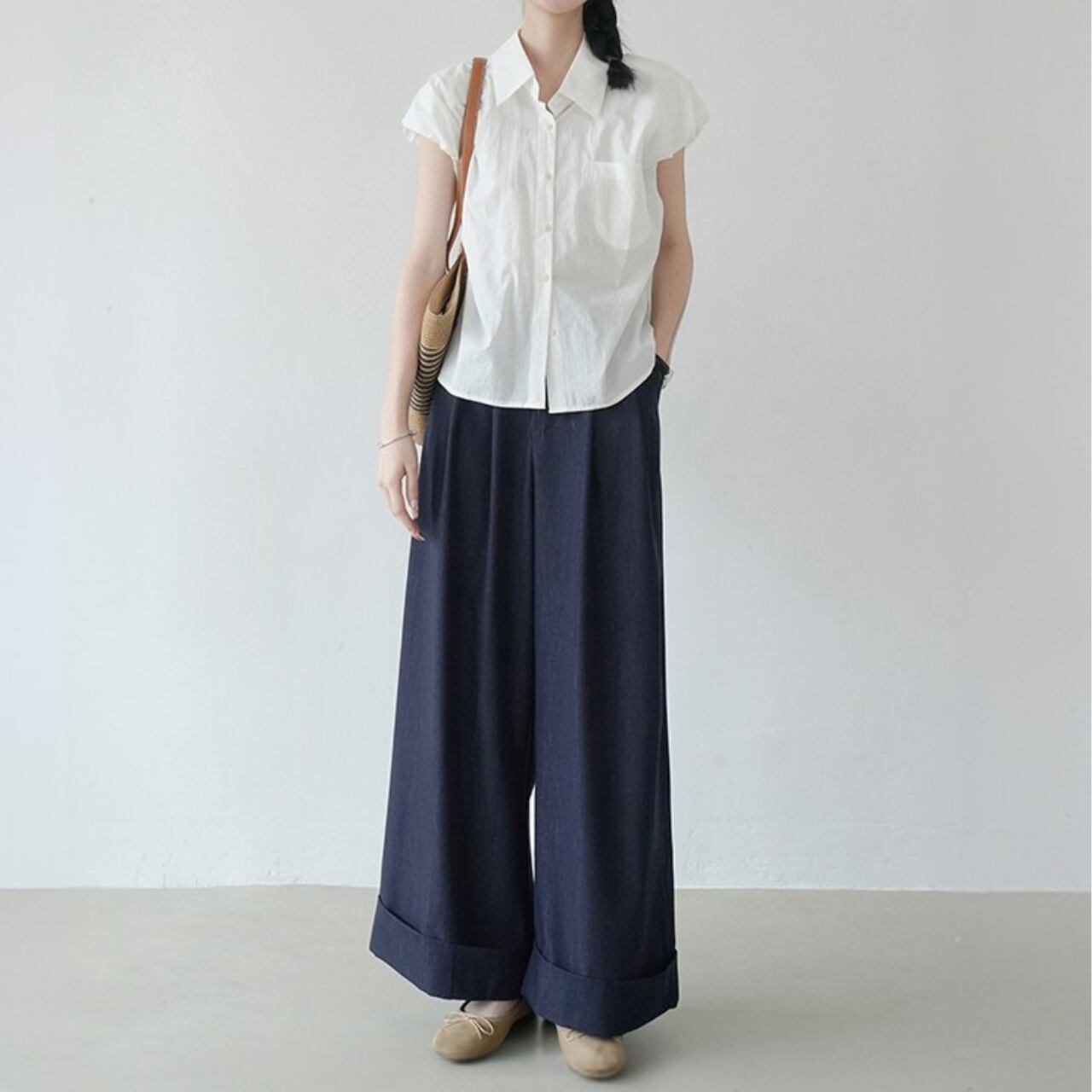 裾の折り返しデザインが目を惹く、上品ワイドパンツ。