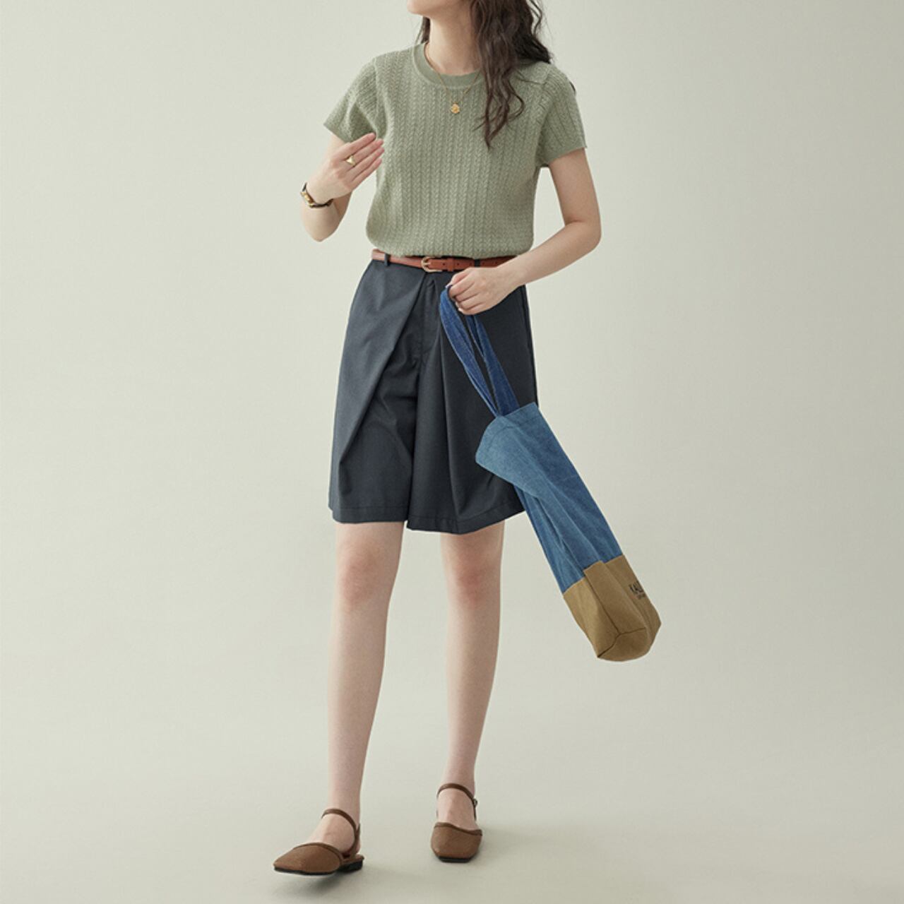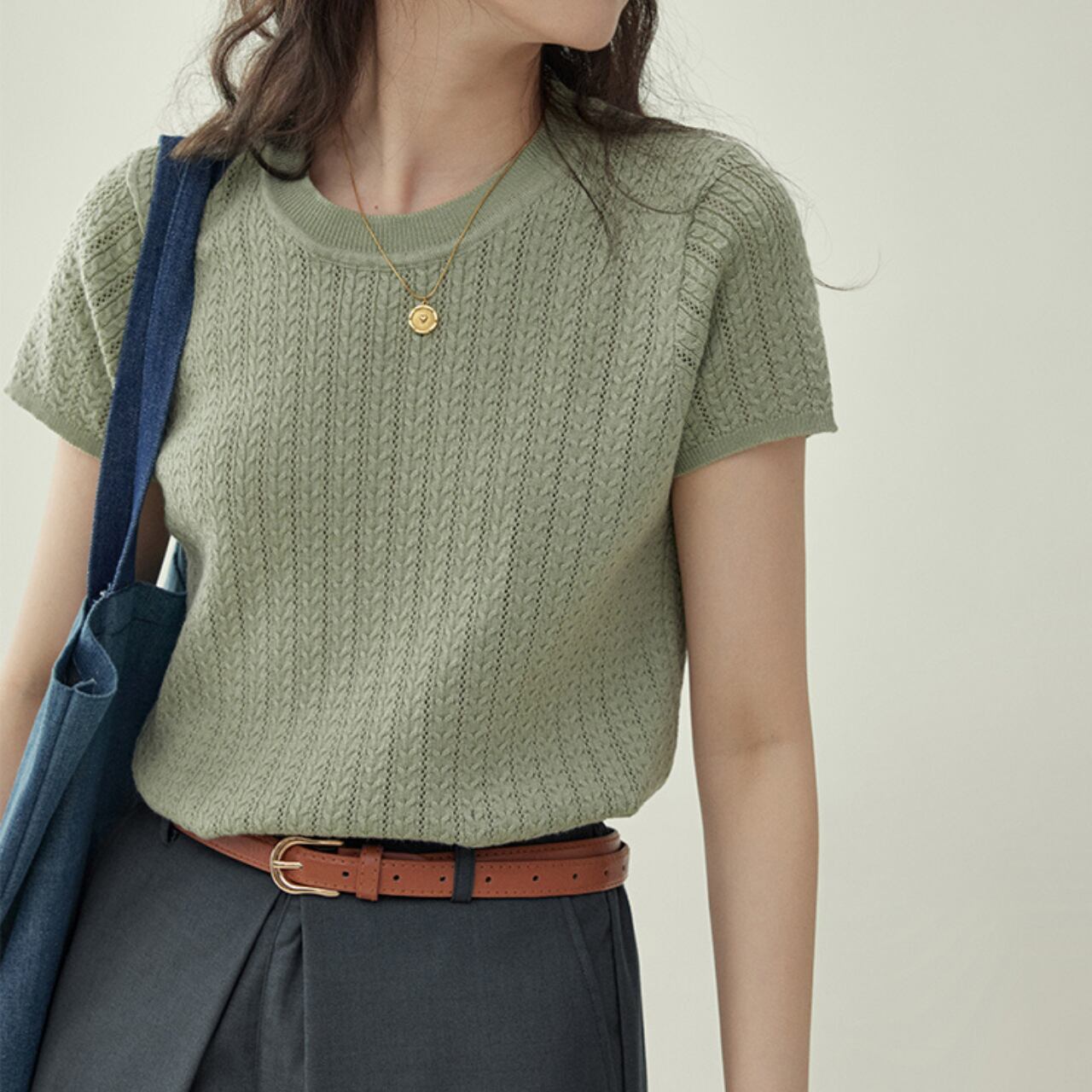 さりげない柄編みが表情を添える、ラウンドネックのニットソー。