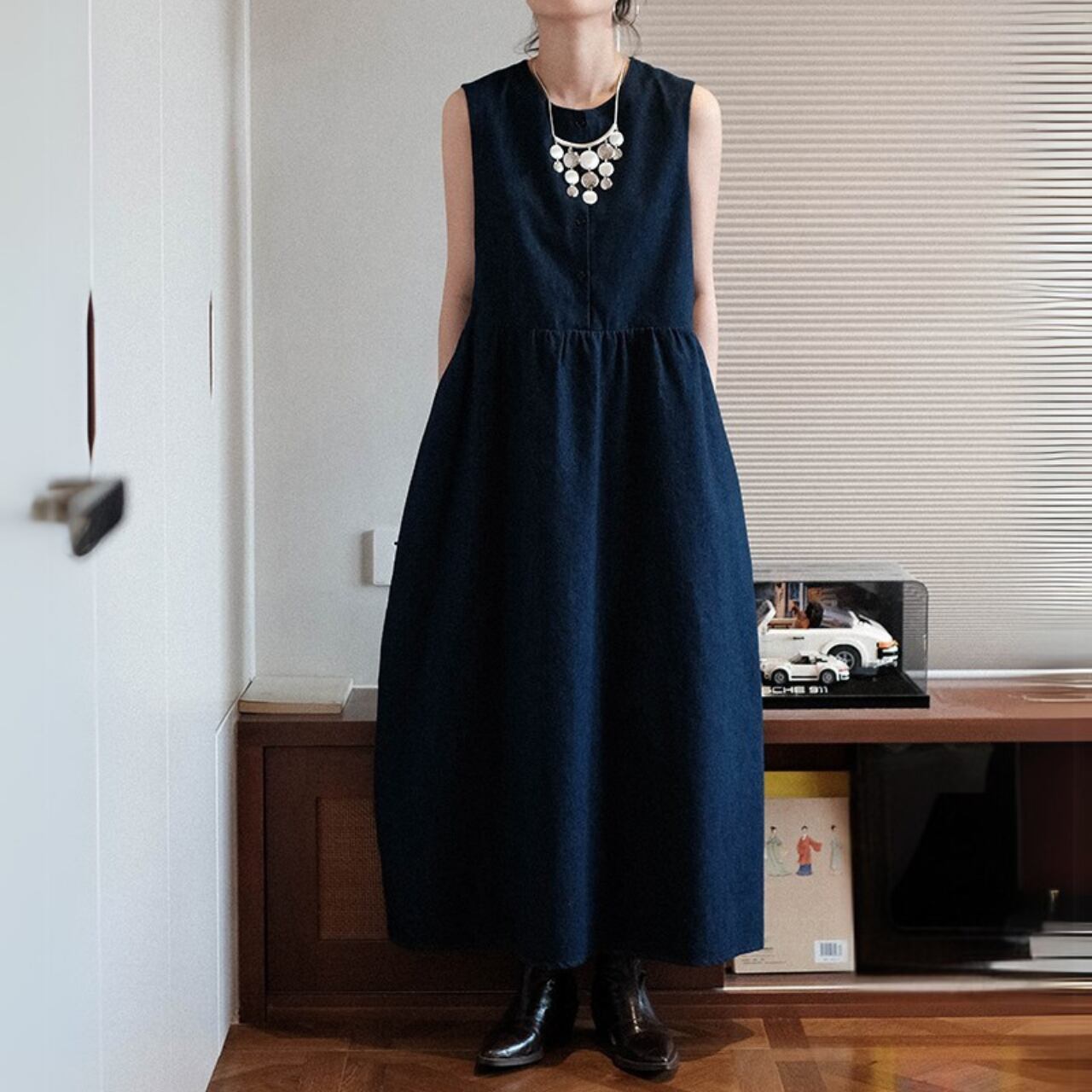 デニムのような風合いが楽しめる、ノースリーブワンピース。