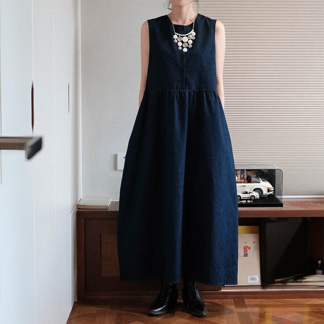 デニムライクノースリーブギャザーワンピース 01064