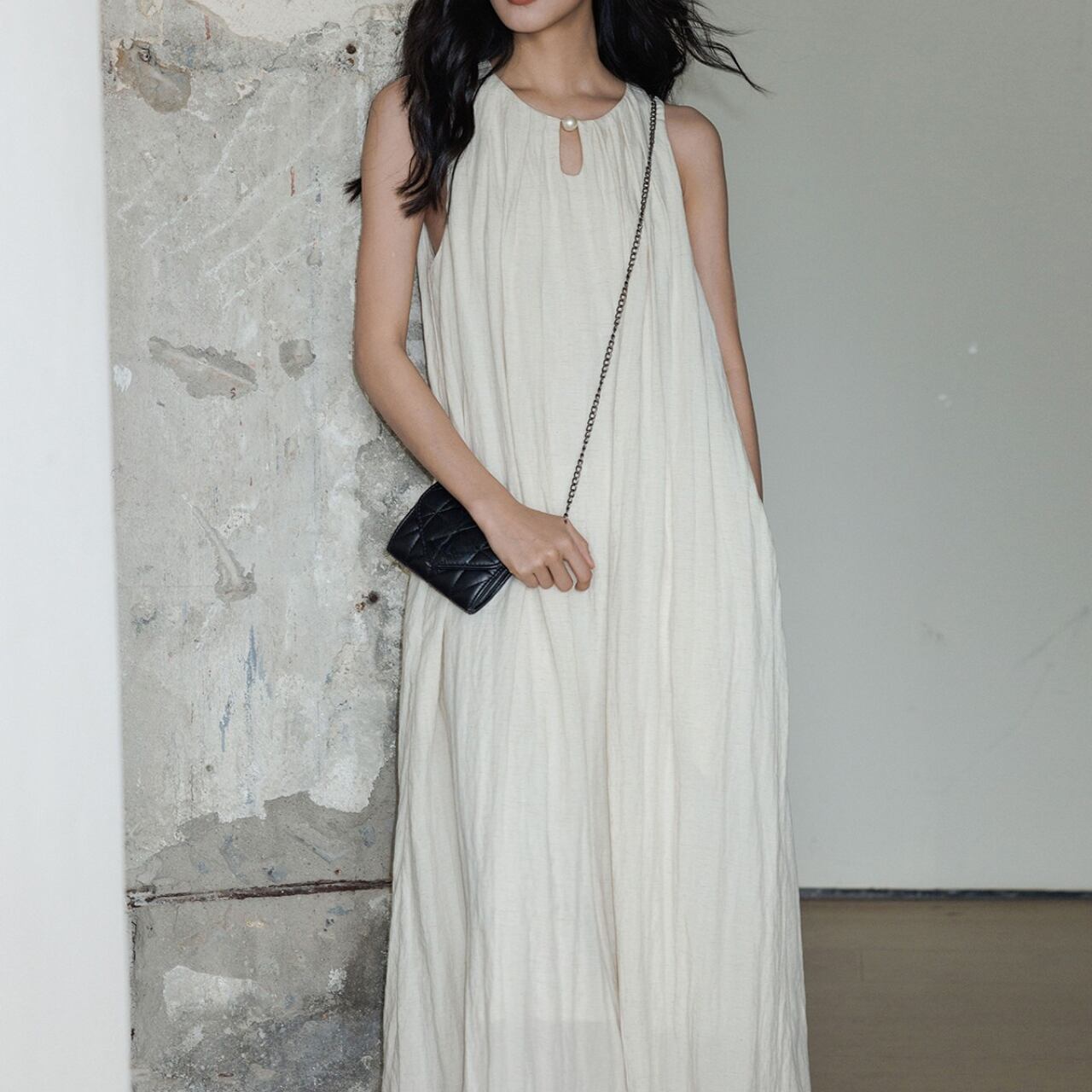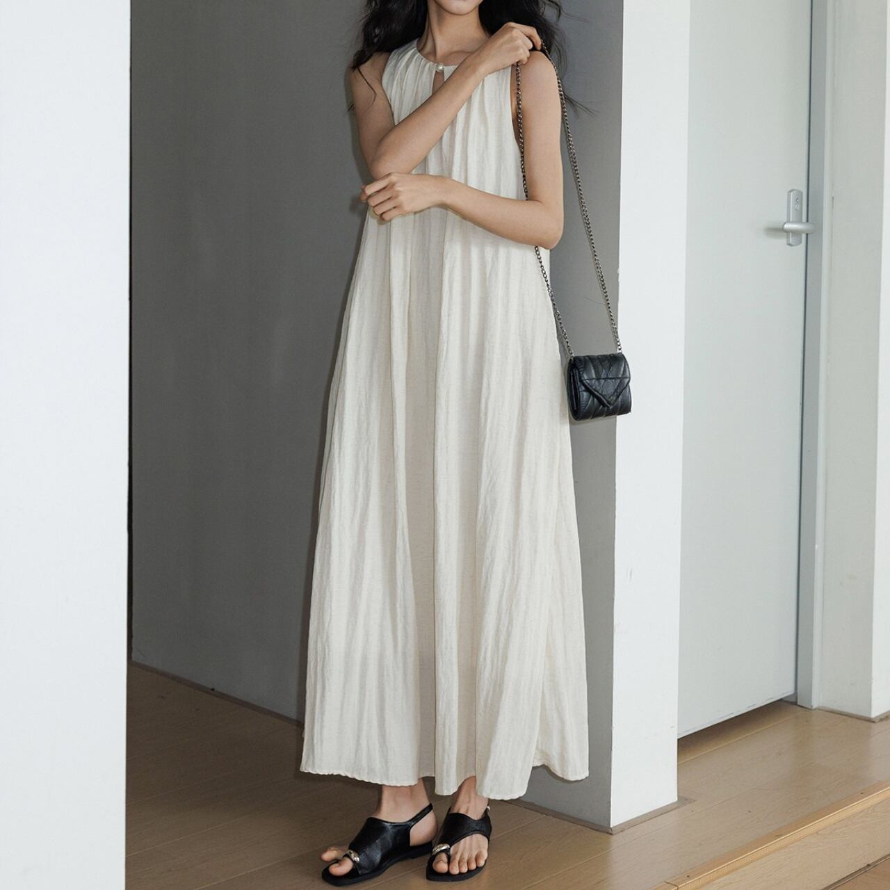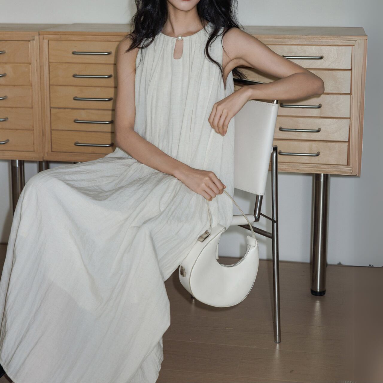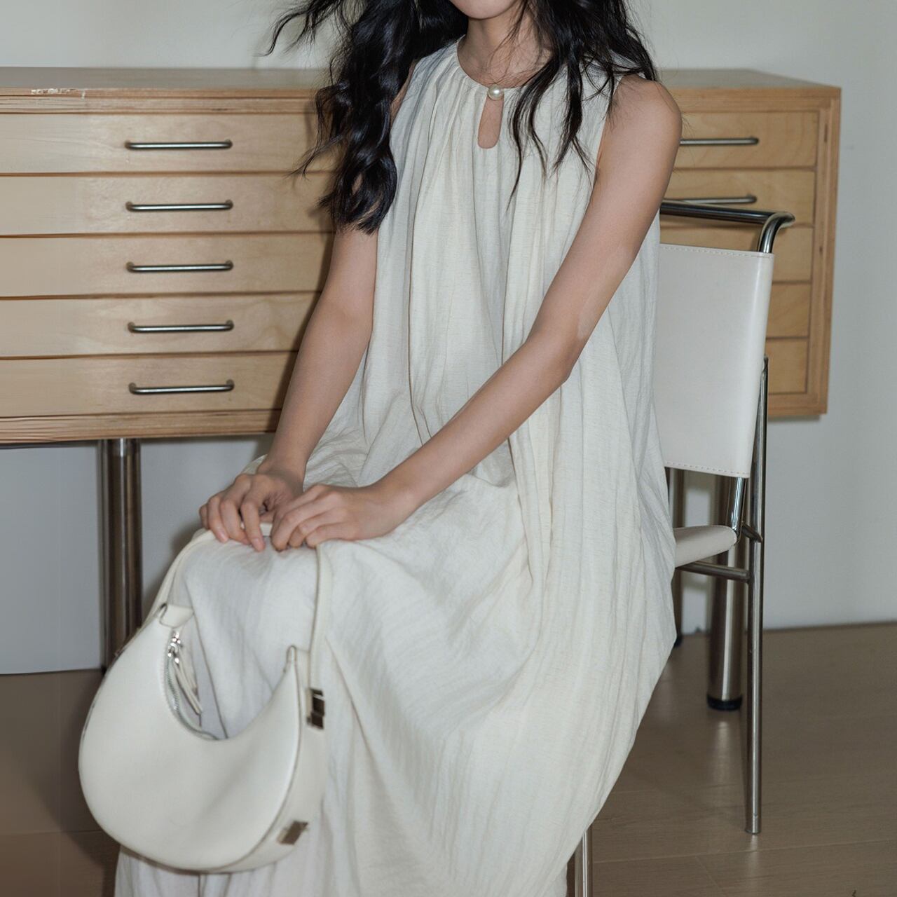 シンプルなトングサンダルや艶感のあるレザー小物を合わせると、程よく力の抜けた大人の洗練スタイルが完成します。