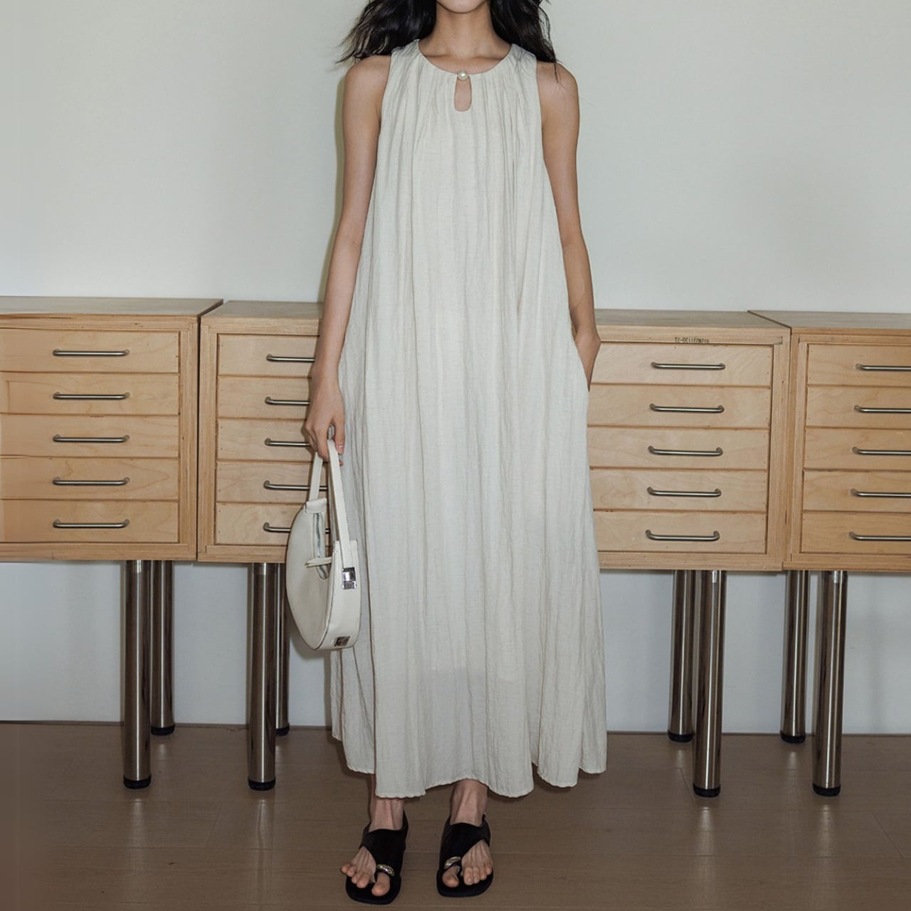 ほんのり光るパール風モチーフがポイントになった、ノースリーブワンピース。