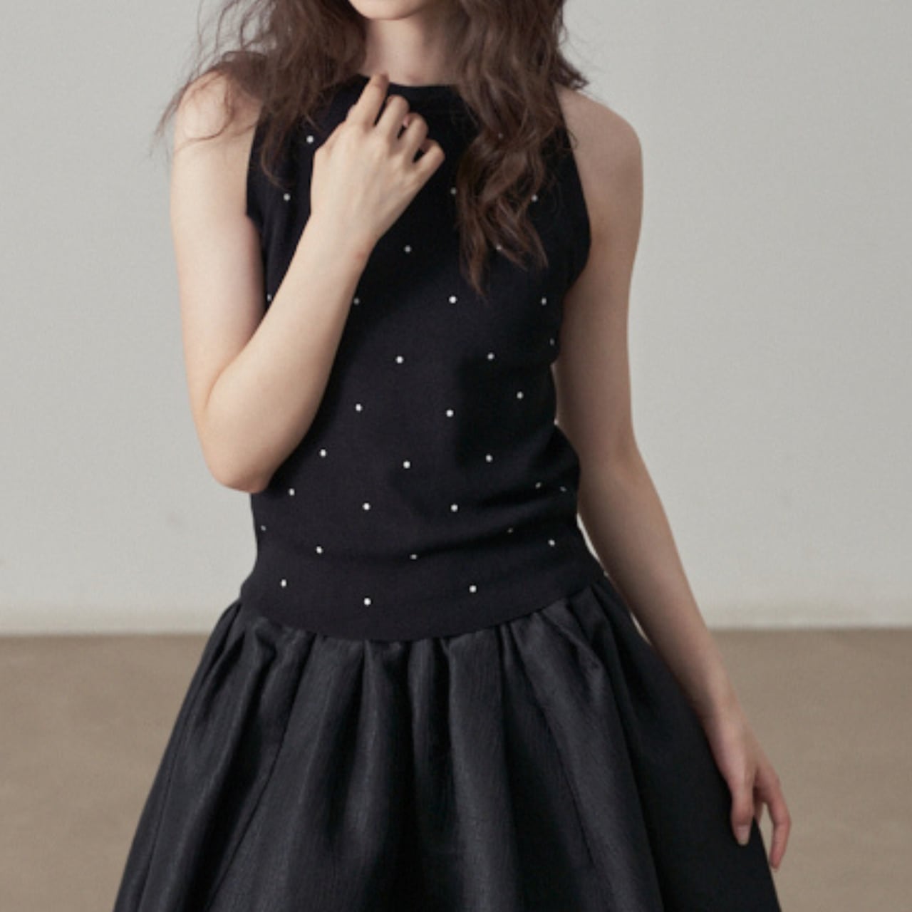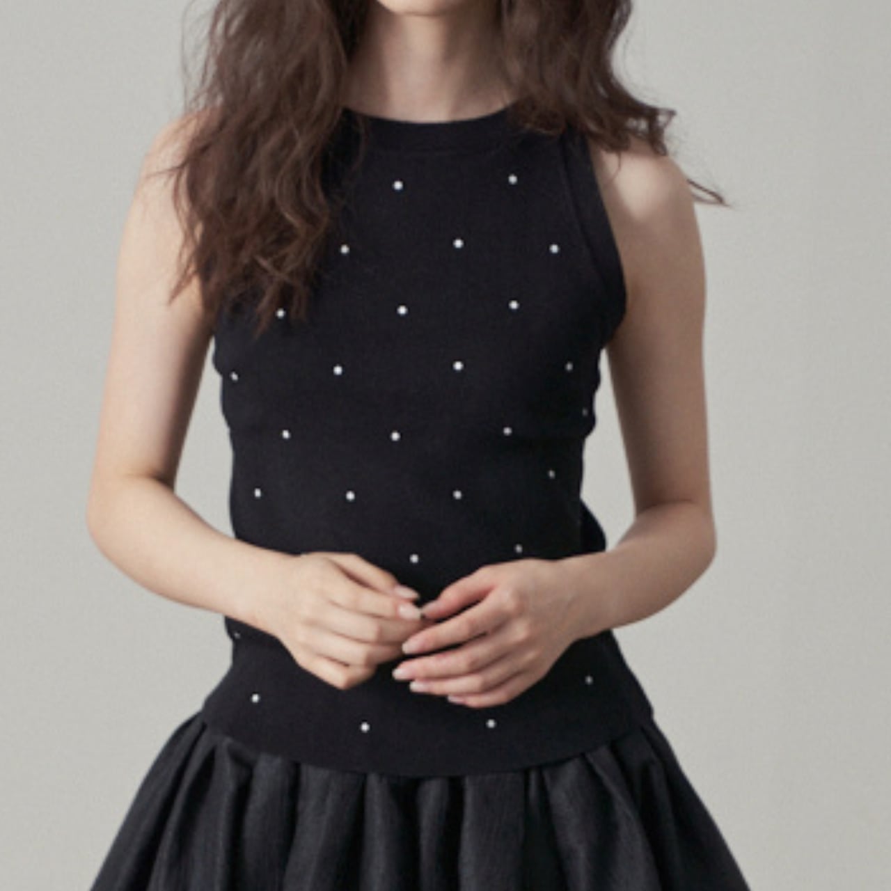 モノトーンのドット柄がシンプルながらも華やかさを演出する、ノースリーブのニットソー。