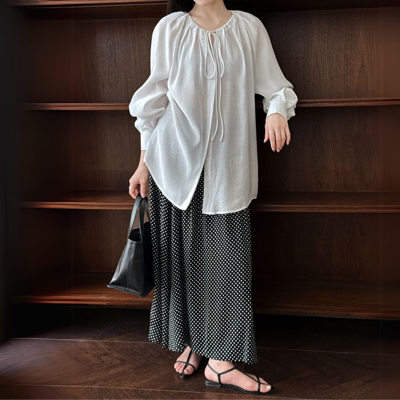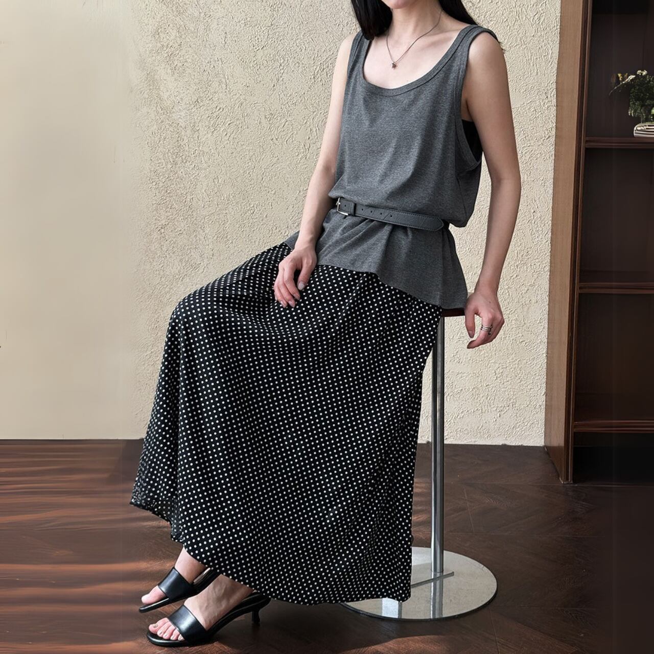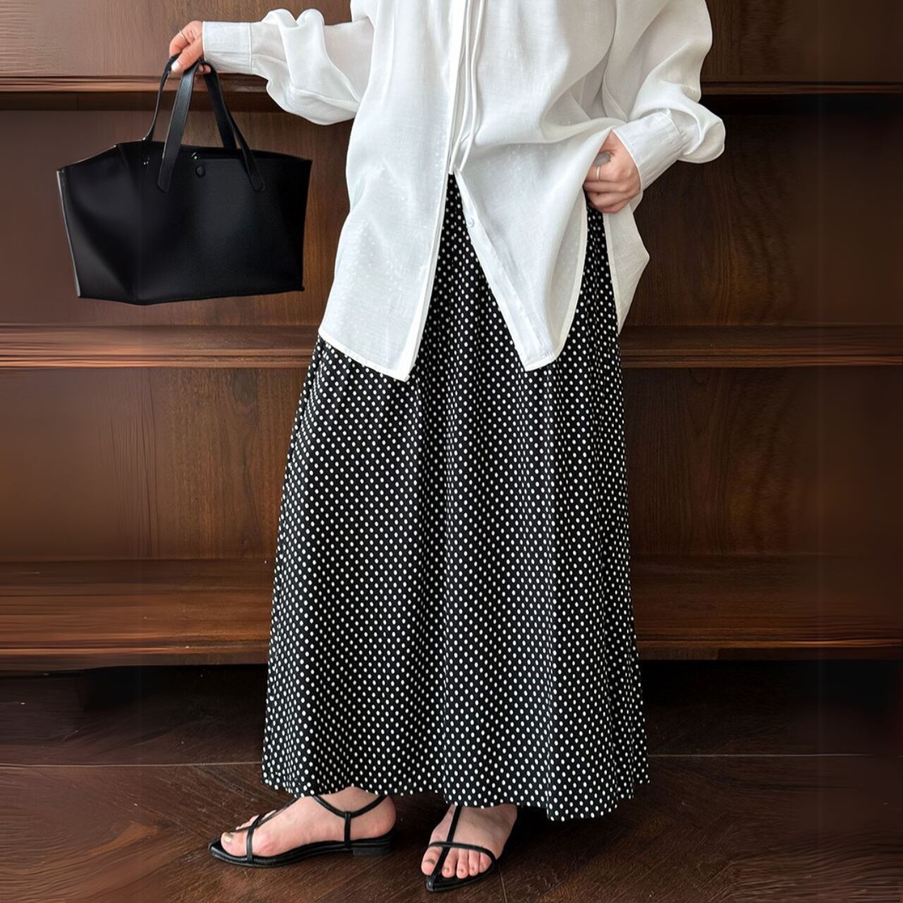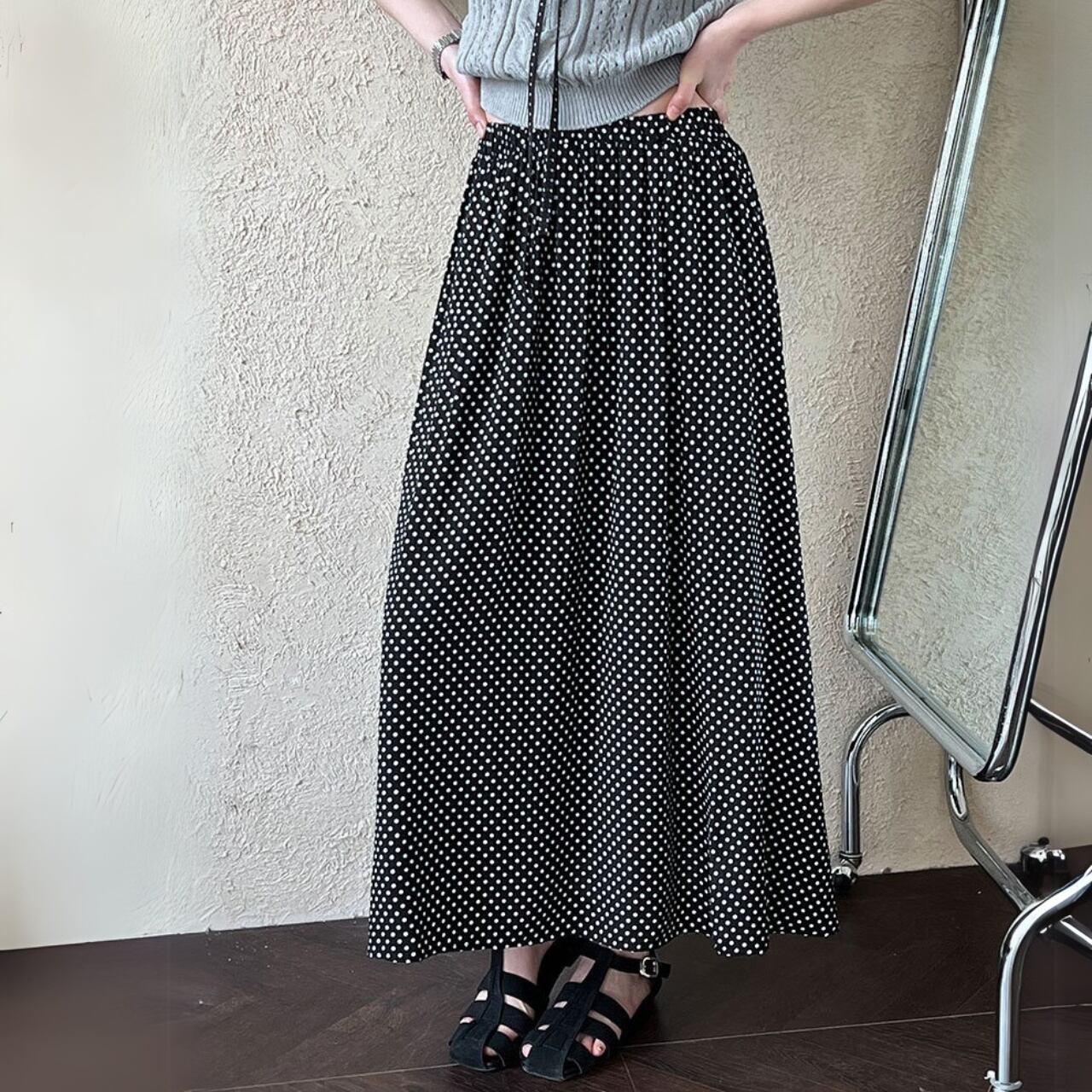細かなドット柄がクラシカルなムードを漂わせるロングスカート。