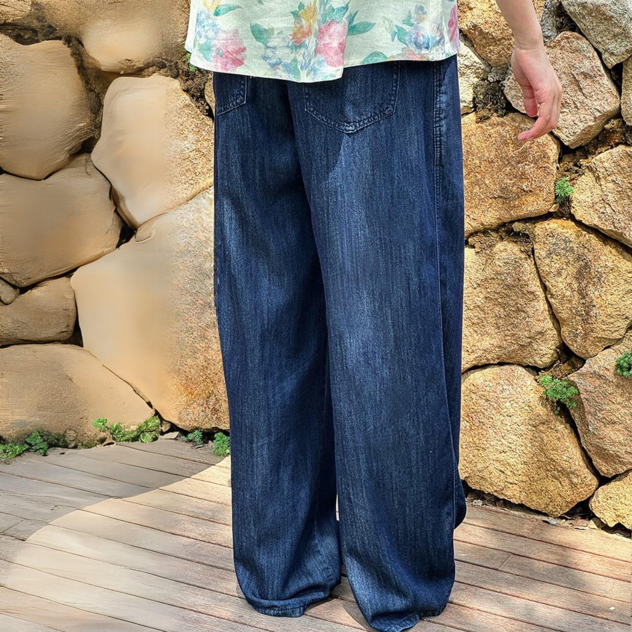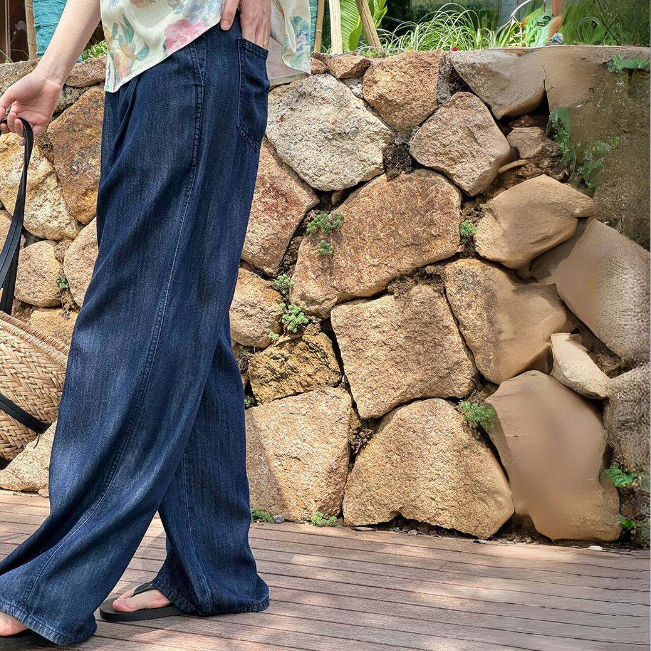 タック入りで腰回りにゆとりがあり、体のラインを拾いすぎず快適な穿き心地。
