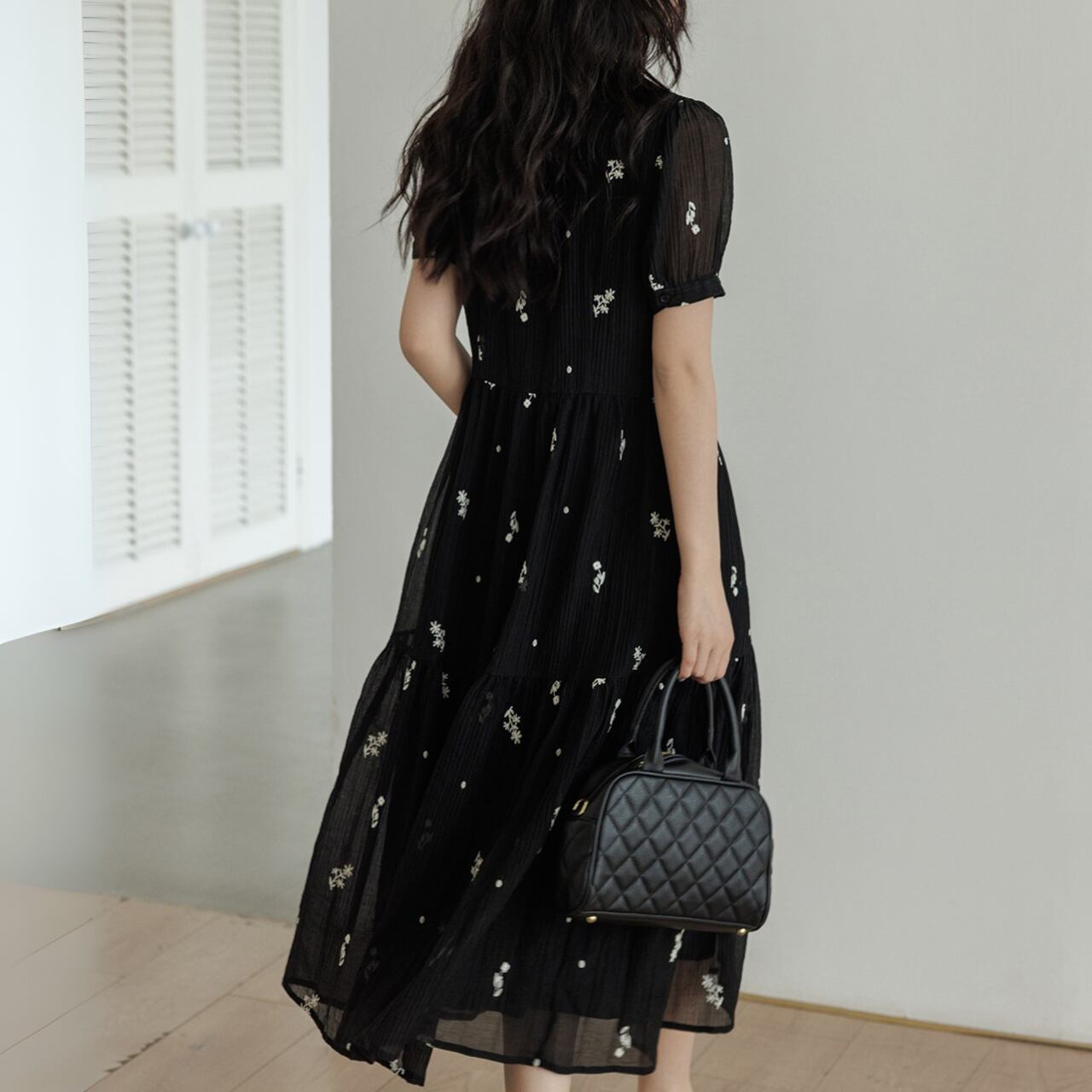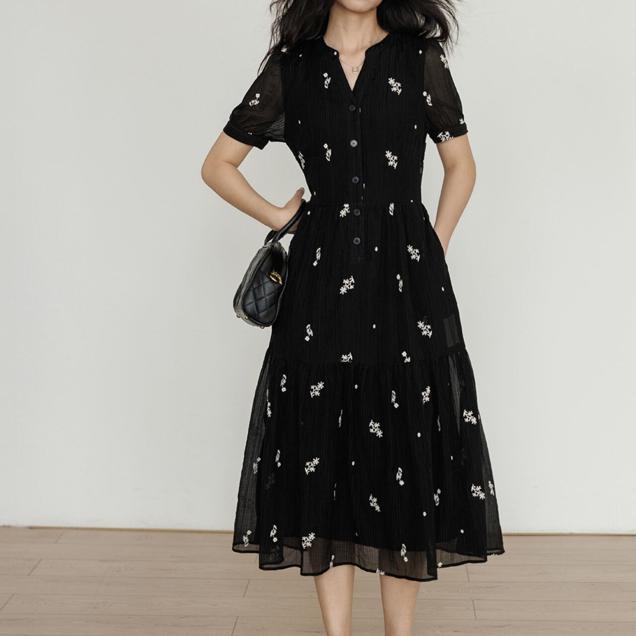 ほんのり透け感のあるシアー素材に、繊細なフラワー刺繍をあしらった上品ワンピース。