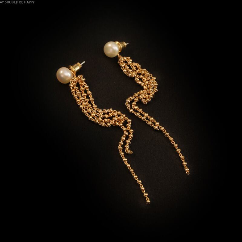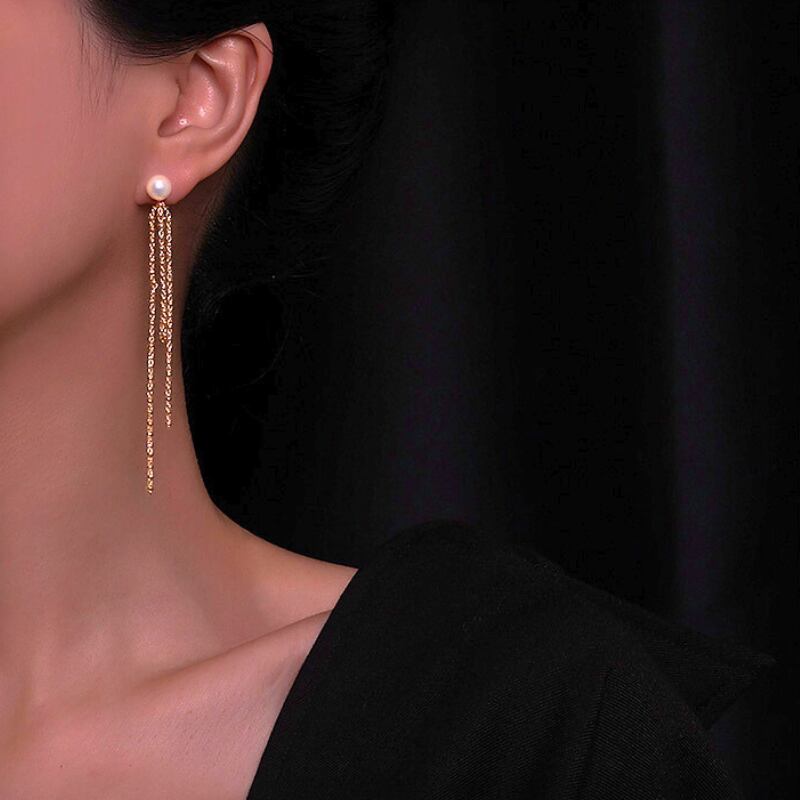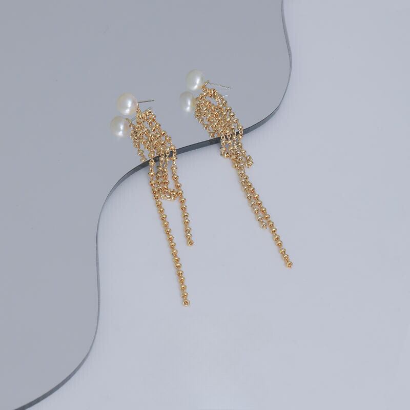 存在感のあるパールとロングチェーンのエレガンスな組み合わせが魅力的な、ゴールドピアス。
