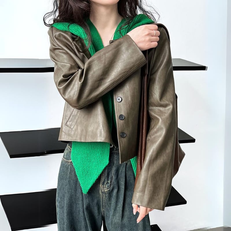 高級感のある生地とスタイリッシュなデザインが魅力的な、ノーカラーレザージャケット。