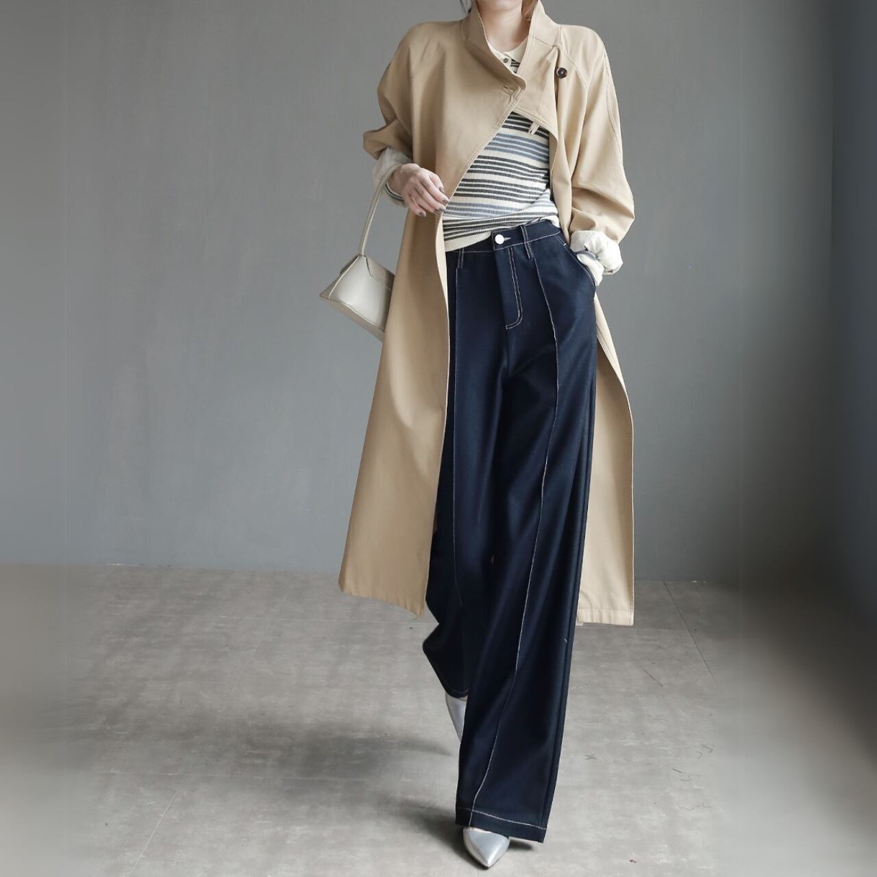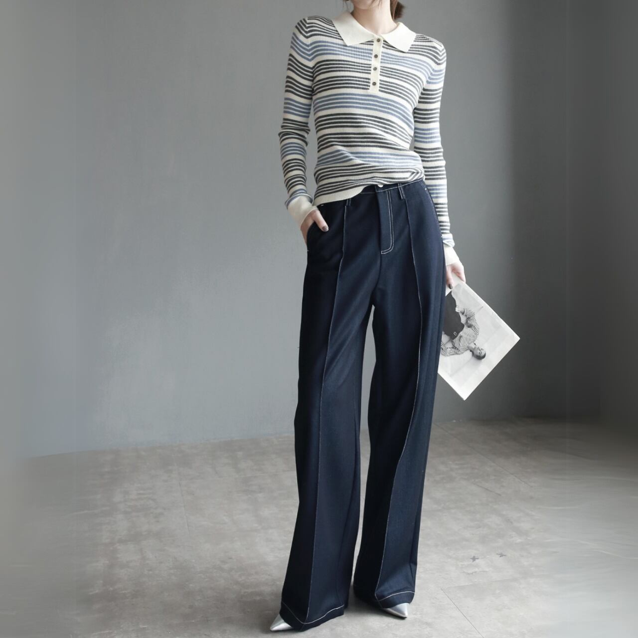 ネイビーに映える白のステッチラインがオシャレな、フルレングスのドレープパンツ。