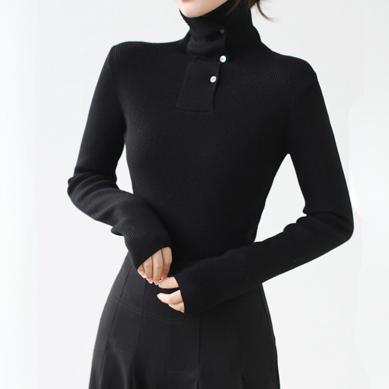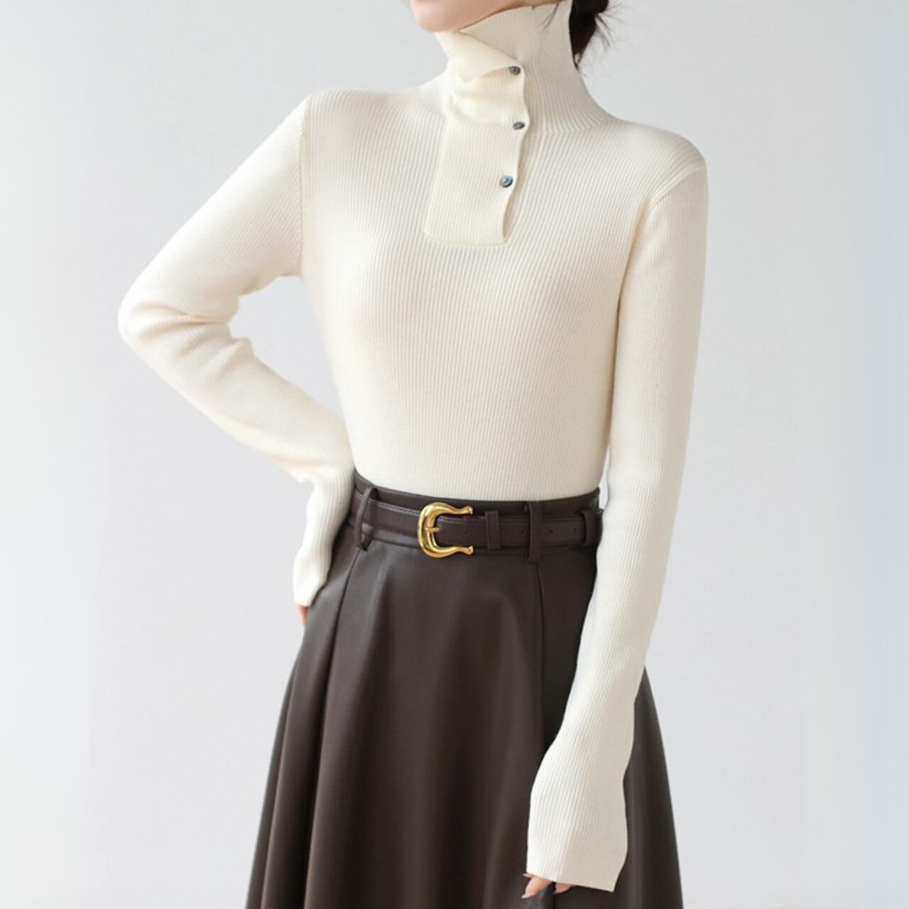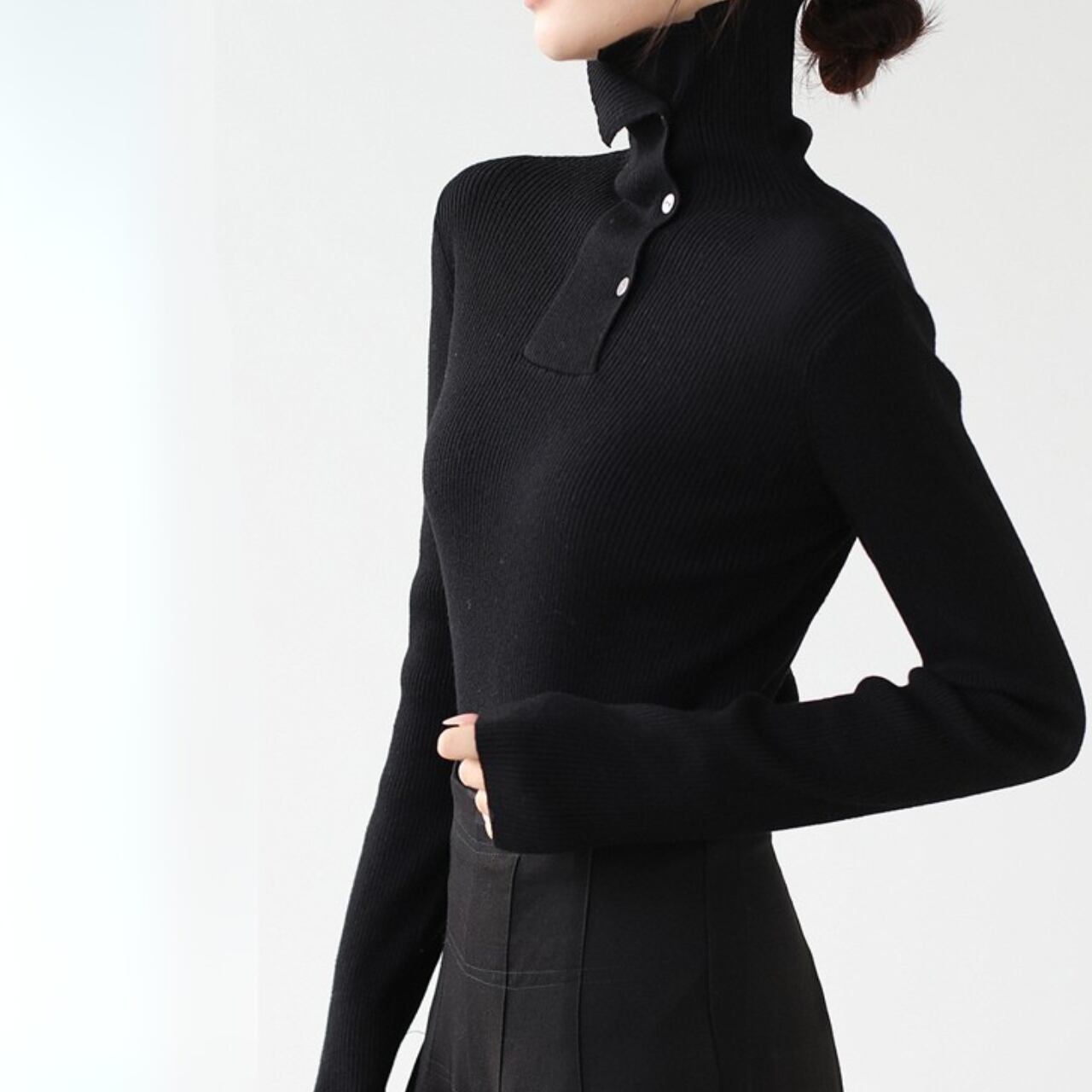 ハーフボタンデザインがアクセントになった、タイトシルエットのリブニット。