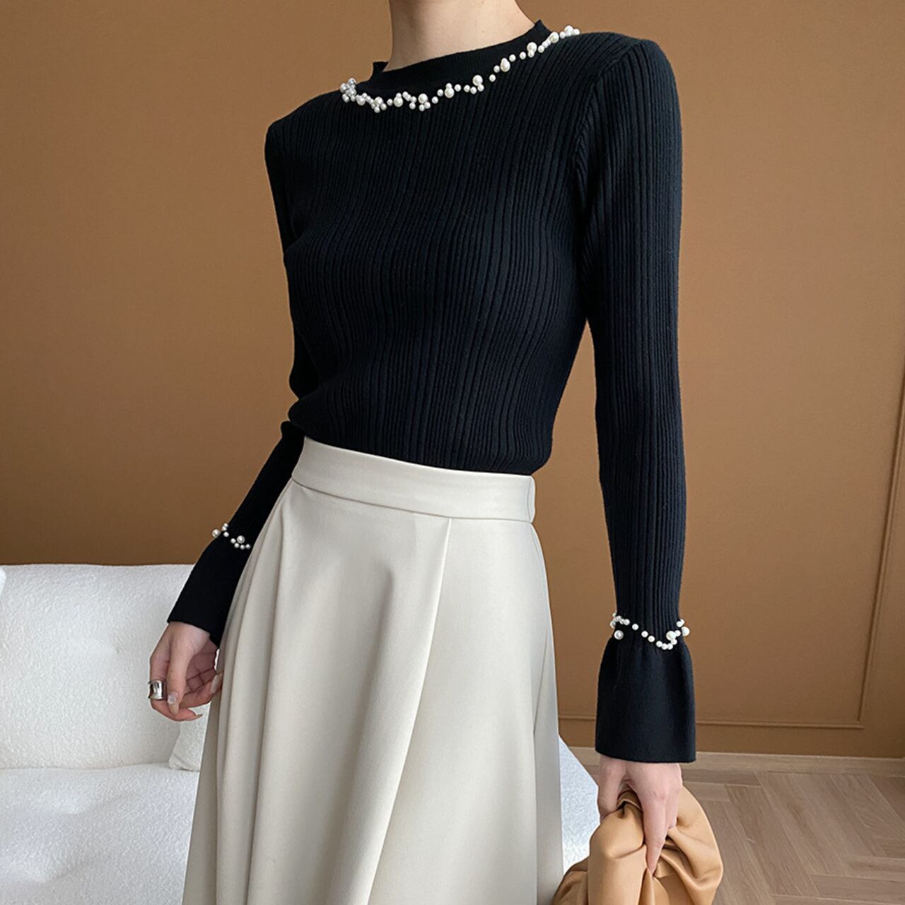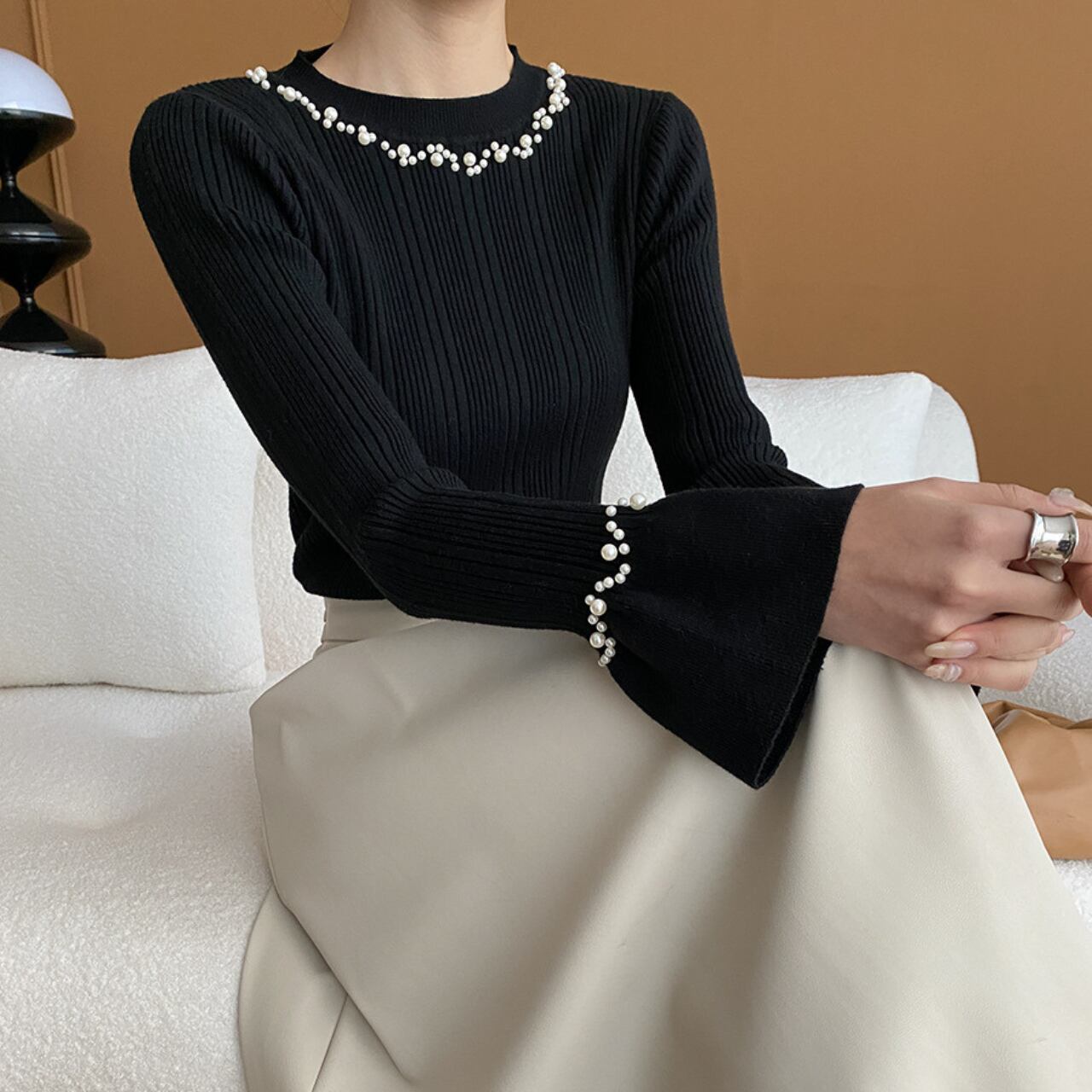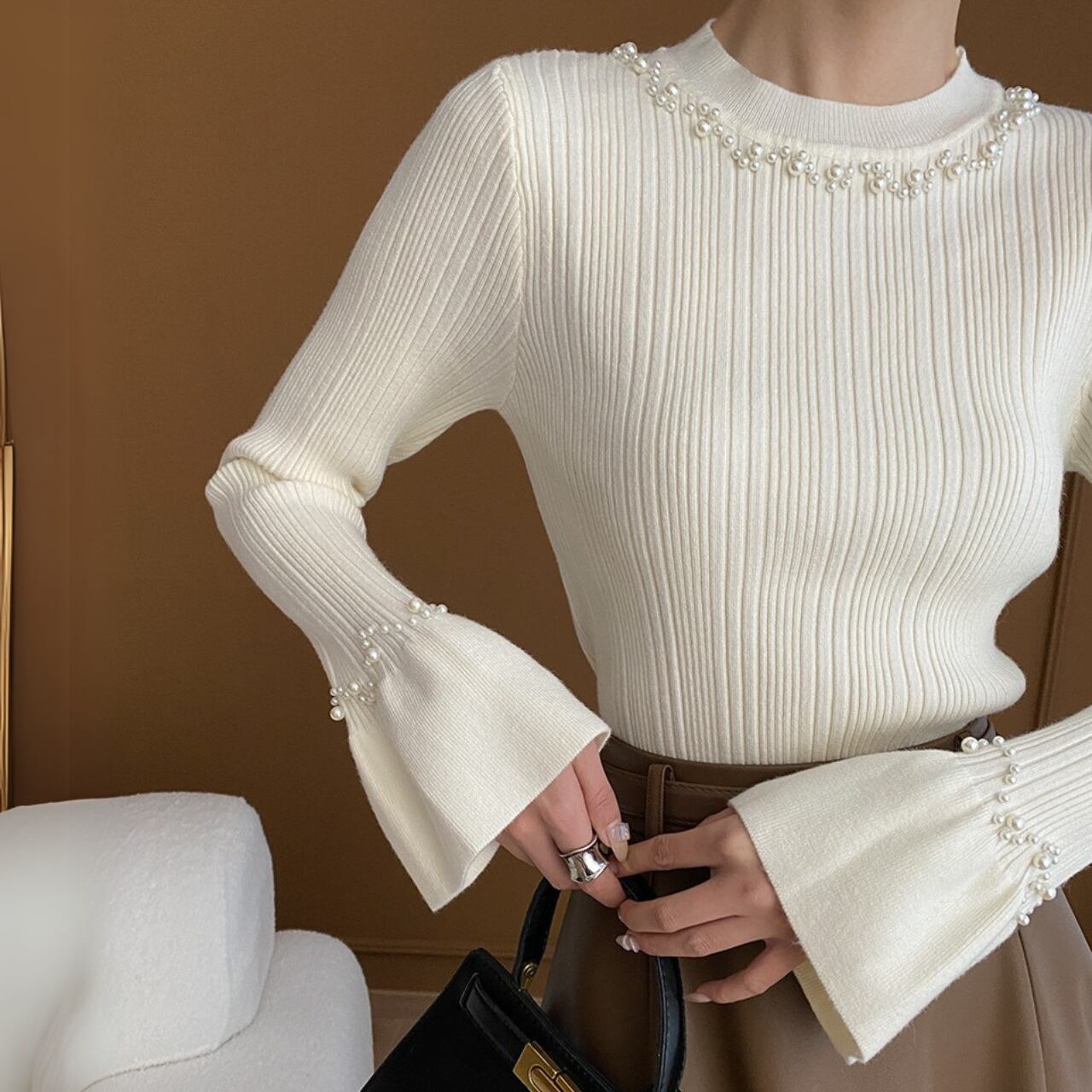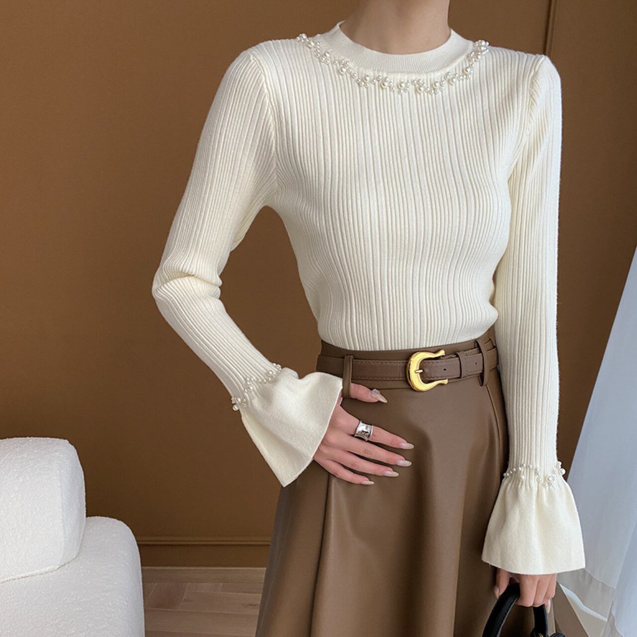 トランペットのように大きく広がった袖口がオシャレな、タイトシルエットのニットソー。